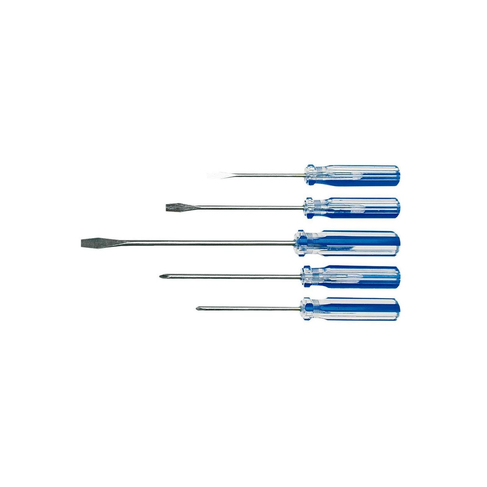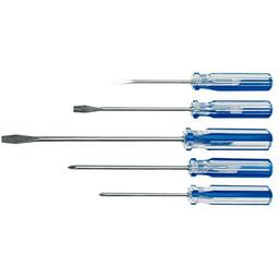 Викрутки, набір 5 шт., загартована вуглецева сталь, розміри: шліцьові 4 x 75 мм, 5 x 100 мм, 5 x 150 мм, PH1 x 100 мм, PH2 x 150 мм.