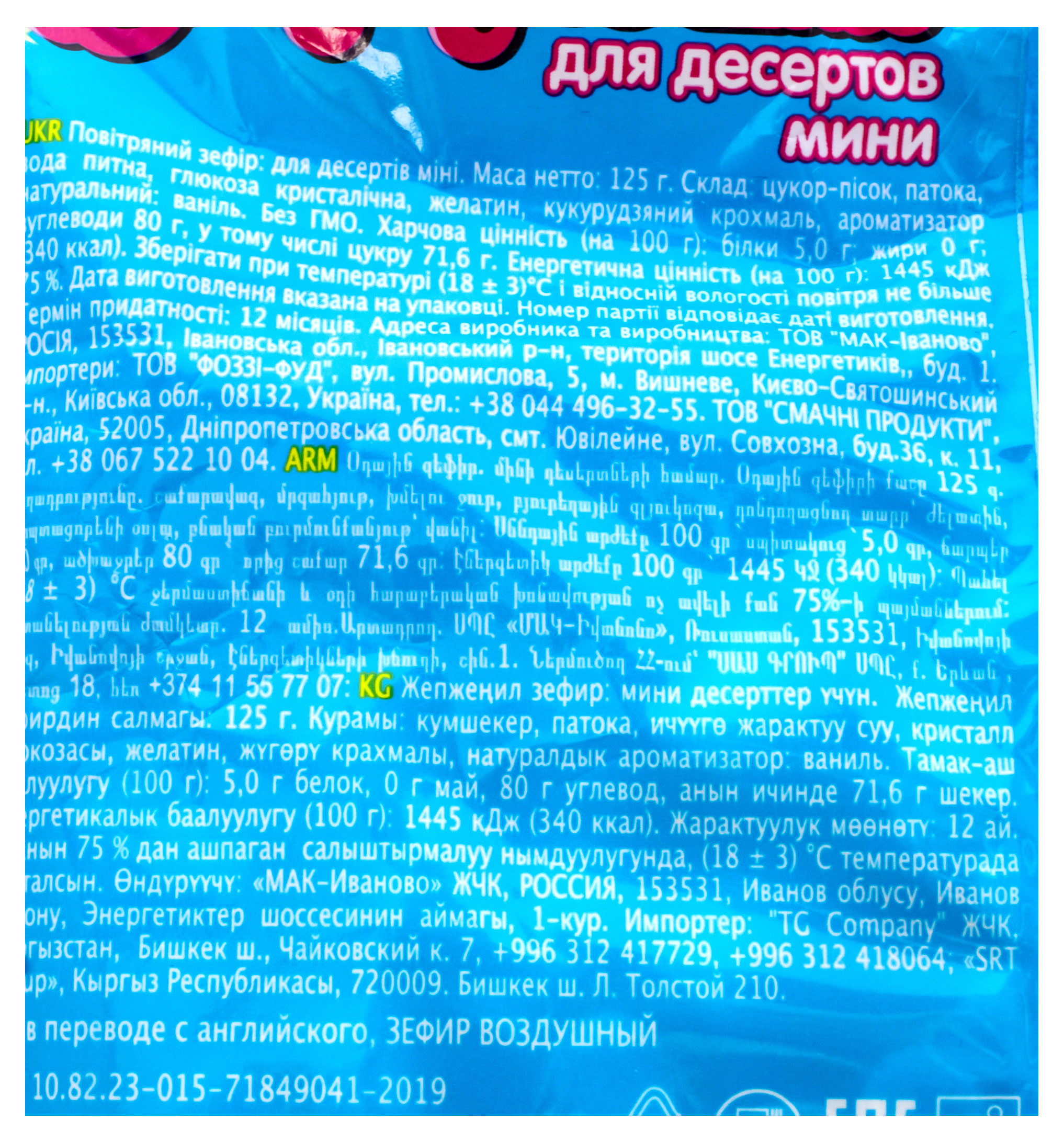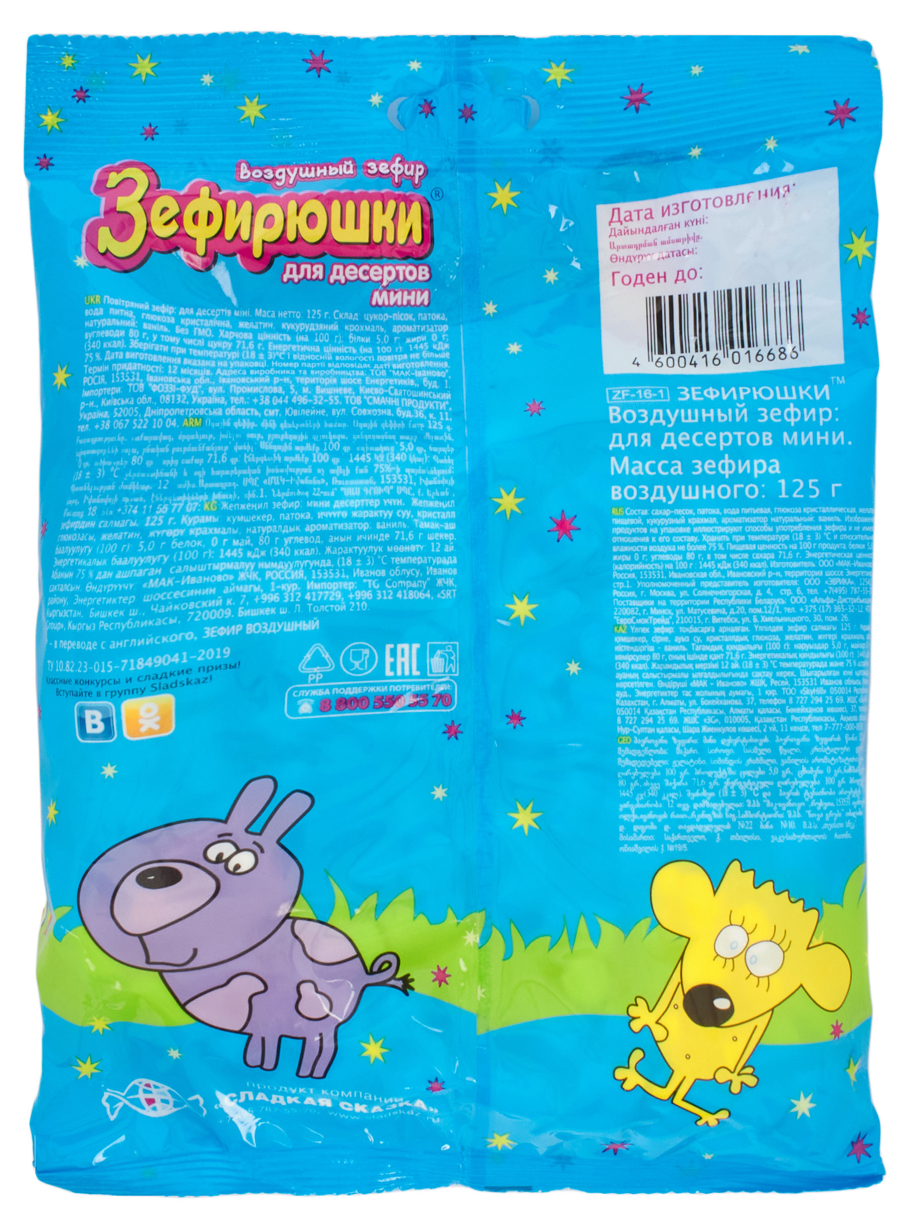 Воздушный зефир «Зефирюшки» изготавливается из натуральных компонентов. Сладкий продукт подходит для приготовления десертов, поможет разнообразить праздничный стол
