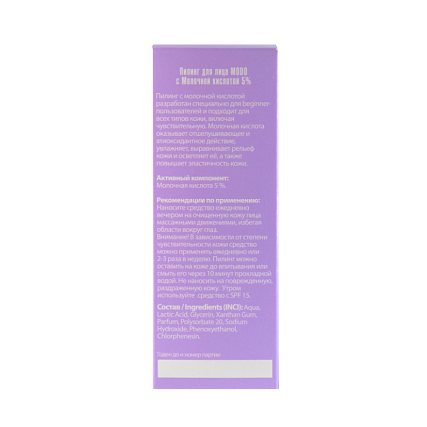 Пилинг с молочной кислотой разработан специально для medium-пользователей и подходит для всех типов кожи, включая чувствительную. Молочная кислота оказывает отшелушивающее и антиоксидантное действие, увлажняет, выравнивает рельеф кожи и осветляет её, а также повышает эластичность кожи.