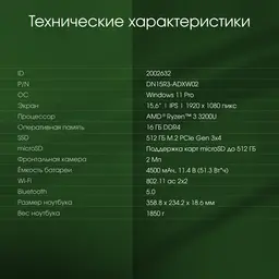 Ноутбук Digma Pro Parvus M Ryzen 3 3200U 16Gb SSD512Gb AMD Radeon Vega 3 15.6" IPS FHD (1920x1080) Windows 11 Pro dk.grey WiFi BT Cam 4500mAh (DN15R3-ADXW02)