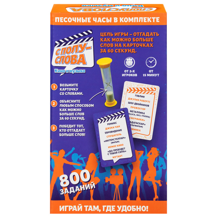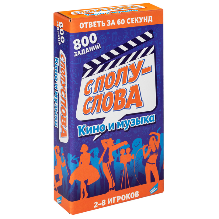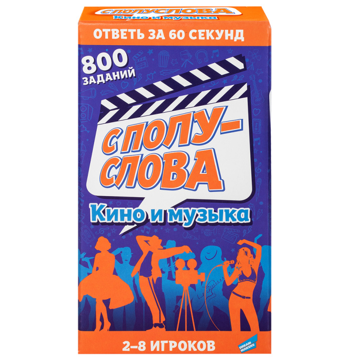 Новая весёлая тематическая настольная игра от бренда Dream Makers "С полуслова. Кино и музыка" - это игра, в которой вам необходимо отгадать как можно больше слов из карточек за 60 секунд! В этой версии популярной настольной игры вам предстоит угадывать любимые фильмы и героев из них, известных музыкантов и музыкальные группы, а так же все , что связано с музыкальным миром и кинематографом. Если вы знакомы с игрой alias, то быстро вспомните, как играть, а если нет, то правила можно понять буквально за пару минут. Объясняйте слова любыми возможными способами, кроме однокоренных слов.