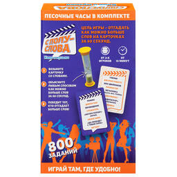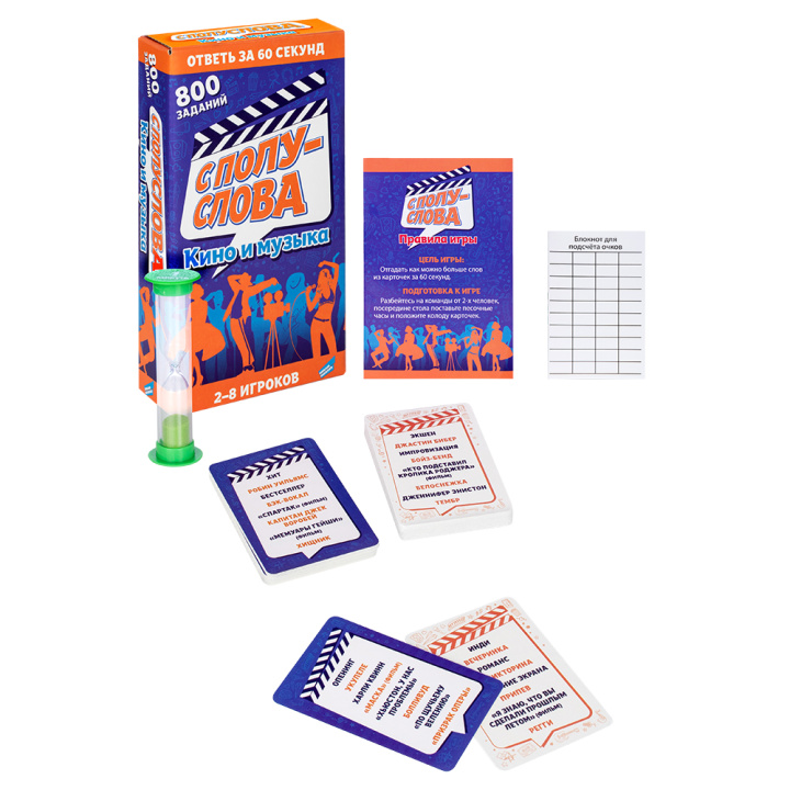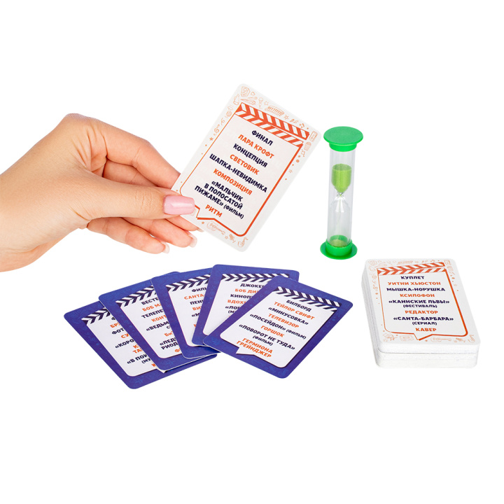 В наборе: игровые карточки: 50 шт.; правила игры: 1 шт.; песочные часы: 1 шт.; блокнот для очков: 1 шт.