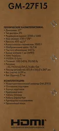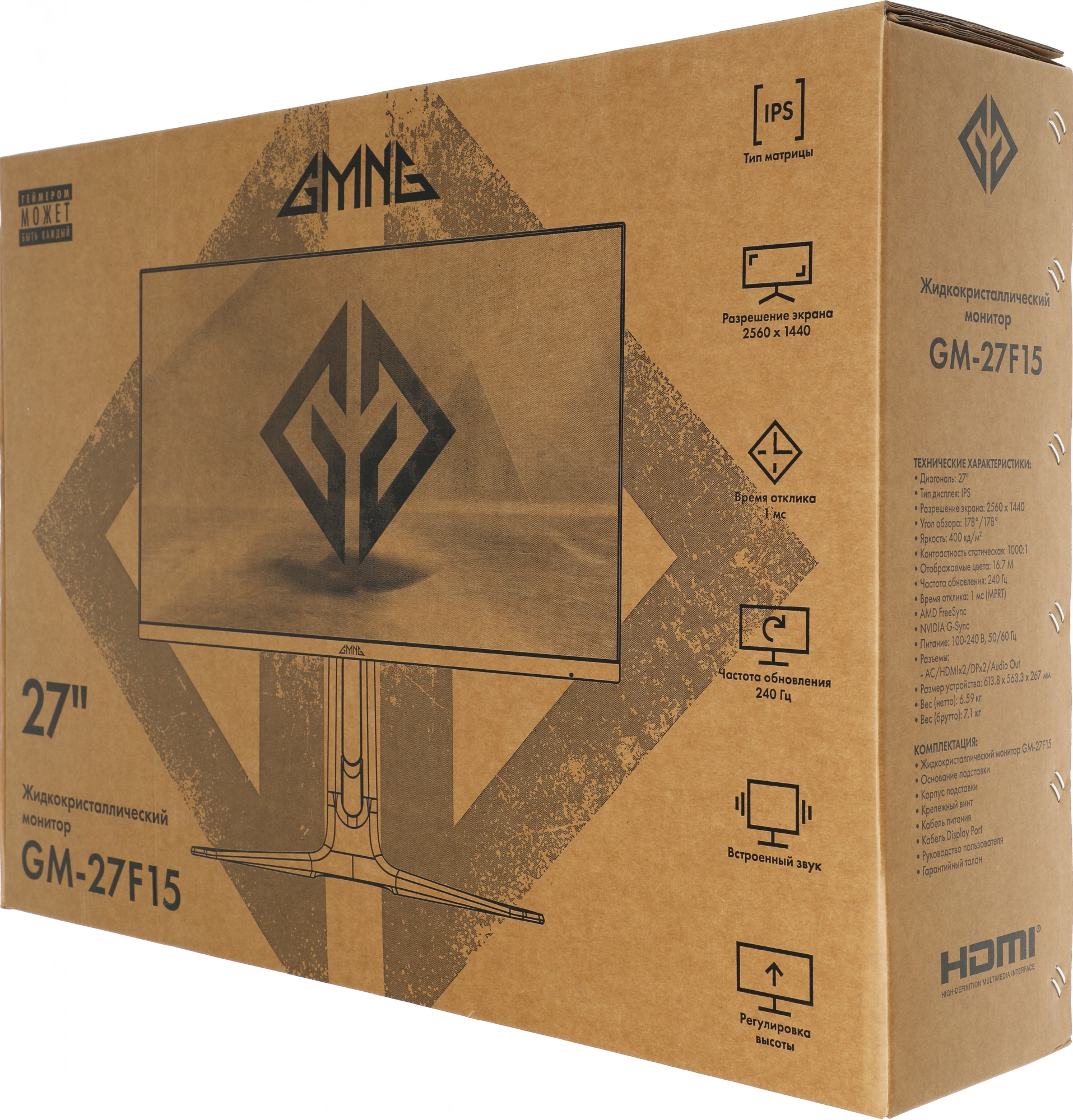 Монитор GMNG 27" Gaming GM-27F15 серый IPS LED 2ms 16:9 HDMI M/M матовая HAS Piv 400cd 178гр/178гр 2560x1440 240Hz G-Sync FreeSync DP Quad 2K (1440p) 6.55кг
