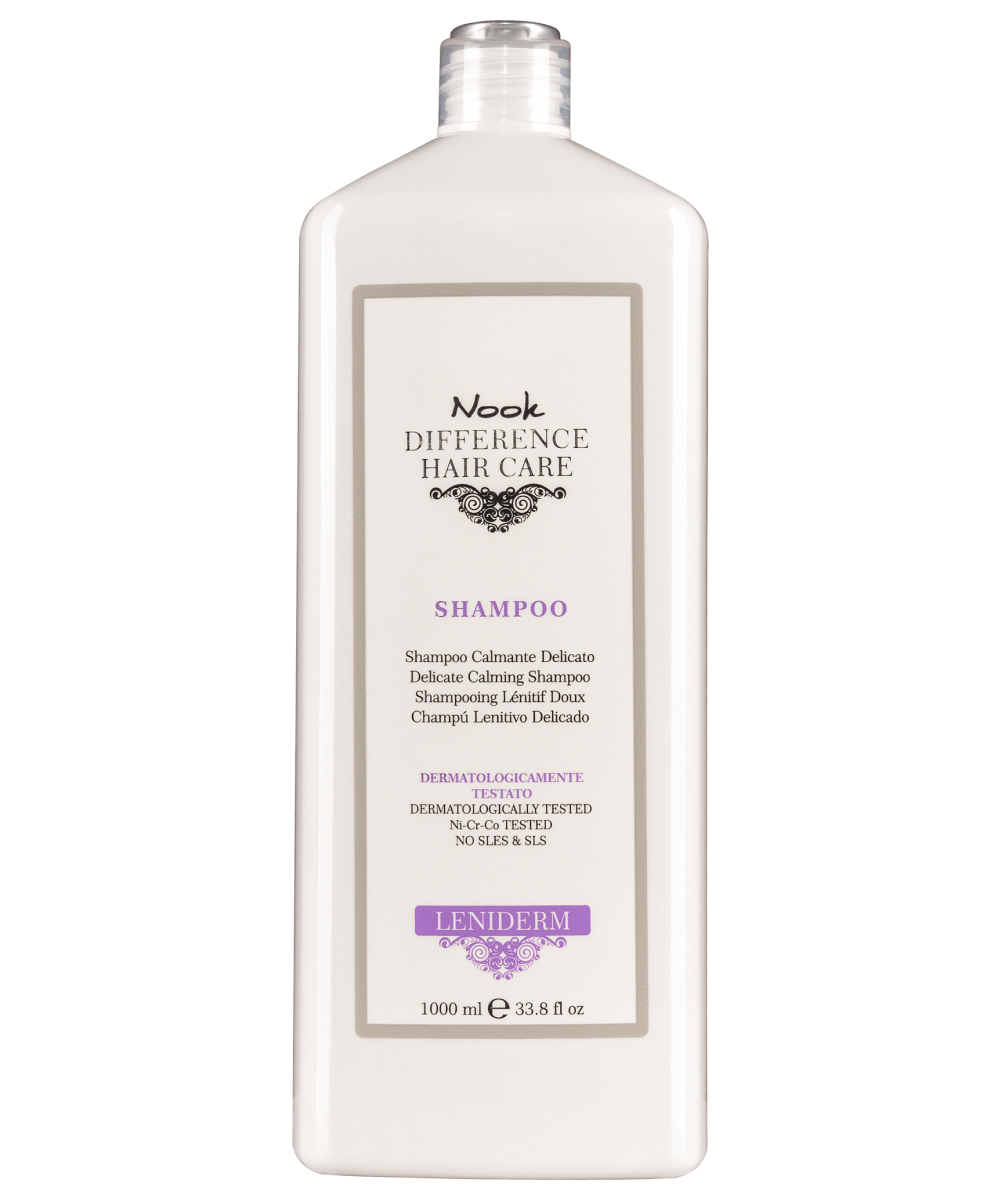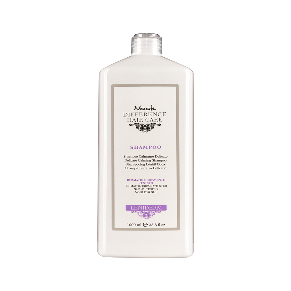 Nook DIFFERENCE HAIR CARE LENIDERM - шампунь подходит для ломких волос и склонной к раздражению кожи головы. Его формула, основанная на эффективных успокаивающих и противогрибковых активных компонентах в сочетании с ультраделикатным очищающим средством, делает его подходящим для ежедневного использования.