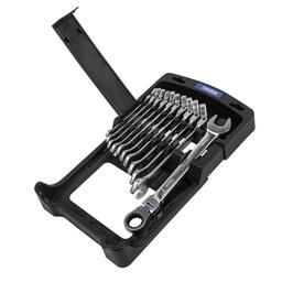 Комбинированный гаечный ключ имеет 2 рабочие части: накидная трещоточная часть и рожковая часть. Для работы в труднодоступных местах подойдет рожковый ключ. Накидной обладает большей эффективностью при отворачивании тугого крепежа. С помощью этих свойств достигается практичность данного типа ключей. Набор комбинированных трещоточных ключей предназначен для монтажа резьбовых соединений при проведении слесарно-монтажных, авторемонтных, сантехнических работ. Трещоточный механизм с шарниром в накидной части ключа, позволяет комфортно работать в местах с ограниченным пространством. Набор оснащен удобным пластиковым держателем-переноской, где у каждого ключа есть свой слот. Ключи изготовлены из высококачественной хромованадиевой стали, что обеспечивает прочность и долговечность.
