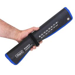 Органайзер для гаечных ключей – это хорошо продуманный аксессуар для хранения инструментов, который изготавливается для комфортного и долговечного пользования. Полотно (держатель) на 14 ключей гаечных. Чехол в развернутом виде имеет размеры 630 мм на 470 мм. Полотно-чехол для комбинированных, рожковых или накидных ключей имеет специальные отверстия с металлической оправой - они позволяют сэкономить место в гараже или мастерской, повесив набор гаечных ключей на стену или специальный стенд. Чехол-полотно для набора ключей гаечных имеет специальную фиксирующую ленту на застежке: набор комбинированных ключей можно скрутить и зафиксировать лентой.