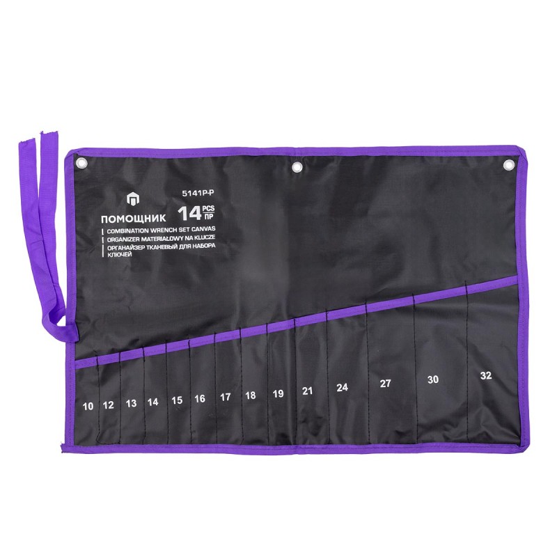 Органайзер для гаечных ключей – это хорошо продуманный аксессуар для хранения инструментов, который изготавливается для комфортного и долговечного пользования. Полотно (держатель) на 14 ключей гаечных. Чехол в развернутом виде имеет размеры 640 мм на 435 мм. Полотно-чехол для комбинированных, рожковых или накидных ключей имеет специальные отверстия с металлической оправой - они позволяют сэкономить место в гараже или мастерской, повесив набор гаечных ключей на стену или специальный стенд. Чехол-полотно для набора ключей гаечных имеет специальную фиксирующую ленту на застежке: набор комбинированных ключей можно скрутить и зафиксировать лентой.