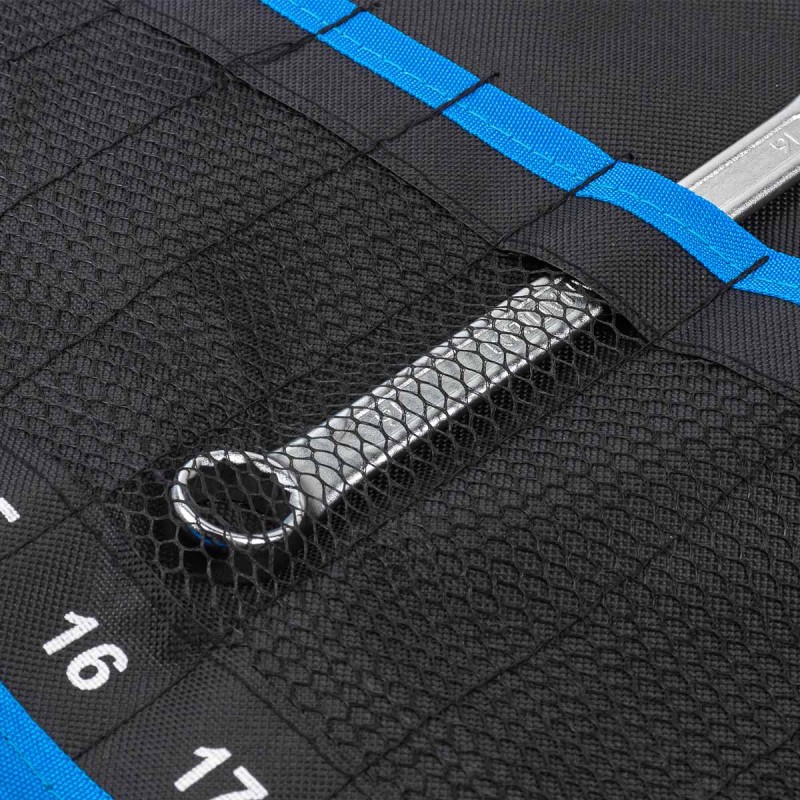 Органайзер для гаечных ключей – это хорошо продуманный аксессуар для хранения инструментов, который изготавливается для комфортного и долговечного пользования. Полотно (держатель) на 14 ключей гаечных. Чехол в развернутом виде имеет размеры 640 мм на 440 мм. Полотно-чехол для комбинированных, рожковых или накидных ключей имеет специальные отверстия с металлической оправой - они позволяют сэкономить место в гараже или мастерской, повесив набор гаечных ключей на стену или специальный стенд. Чехол-полотно для набора ключей гаечных имеет специальную фиксирующую ленту на застежке: набор комбинированных ключей можно скрутить и зафиксировать лентой.