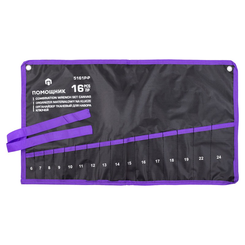 Органайзер для гаечных ключей – это хорошо продуманный аксессуар для хранения инструментов, который изготавливается для комфортного и долговечного пользования. Полотно (держатель) на 16 ключей гаечных. Чехол в развернутом виде имеет размеры 615 мм на 350 мм. Полотно-чехол для комбинированных, рожковых или накидных ключей имеет специальные отверстия с металлической оправой - они позволяют сэкономить место в гараже или мастерской, повесив набор гаечных ключей на стену или специальный стенд. Чехол-полотно для набора ключей гаечных имеет специальную фиксирующую ленту на застежке: набор комбинированных ключей можно скрутить и зафиксировать лентой.
