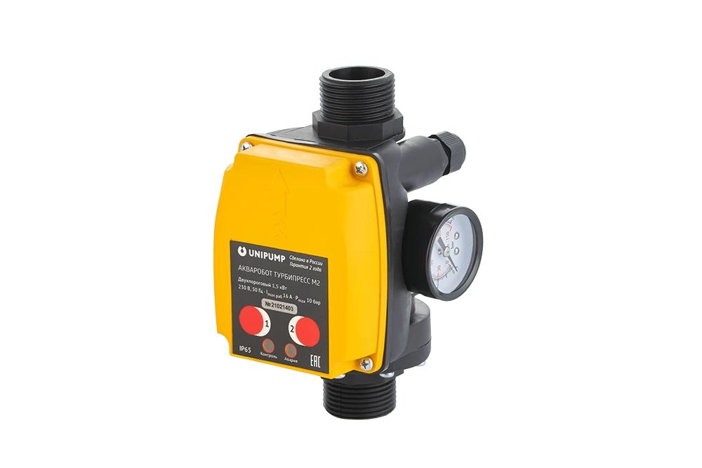 Блок выпускается с подключенными кабелями со штепсельной вилкой и розеткой.Блок автоматического управления насосом АКВАРОБОТ ТУРБИПРЕСС М2 предназначен для автоматического управления однофазными насосами мощностью до 1,5 кВт по потоку жидкости и по давлению в системе.Функциональные возможности:• пользовательская настройка давления включения Pмин и давления выключения Pмакс насоса;• автоматически включает насос при снижении давления в системе ниже Pмин;• автоматически выключает насос при достижении в системе давления Pмакс;• автоматически выключает насос, если он не может создать давление верхнего порога при отсутствии потока жидкости;• защищает насос от работы в режиме «сухого хода» и осуществляет серию пробных пусков для выхода из режима аварии;• защищает систему водоснабжения от возникновения давления более 10 бар в режиме настройки порогов давления;• стабильно работает при пониженном напряжении в электрической сети до 170 В.* Примечание: При понижении сетевого напряжения