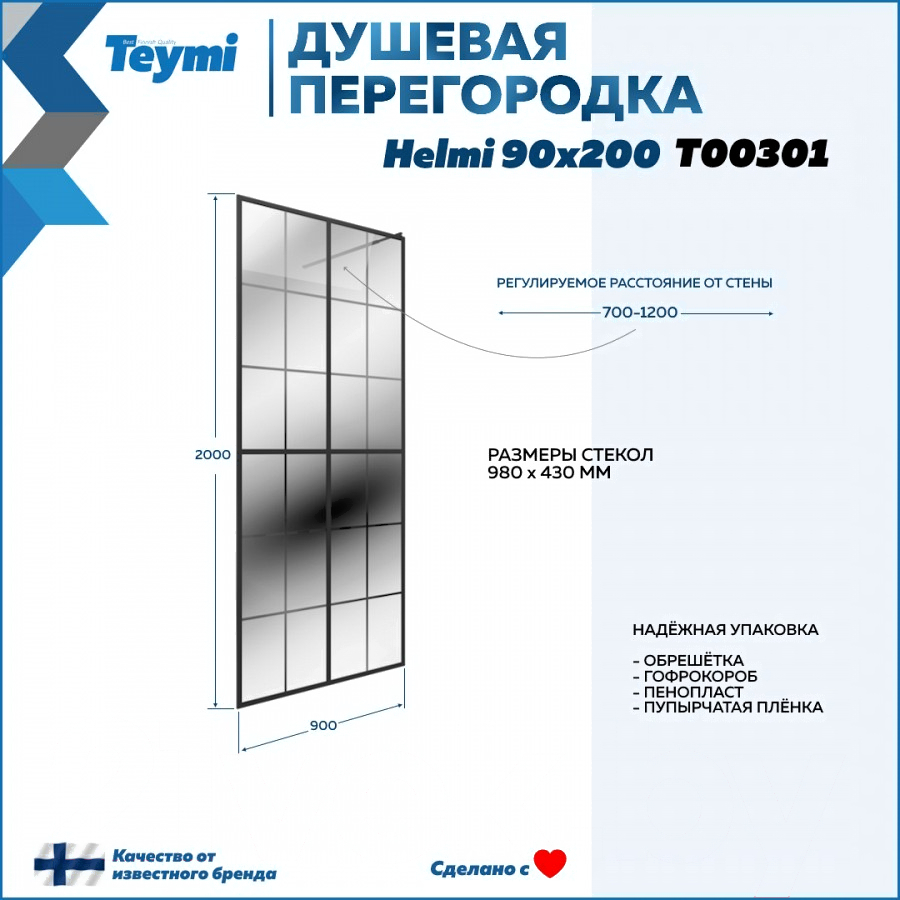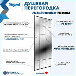 Стеклянная шторка для ванны Teymi Helmi 90x200 / T00301 (прозрачное стекло/черный матовый )