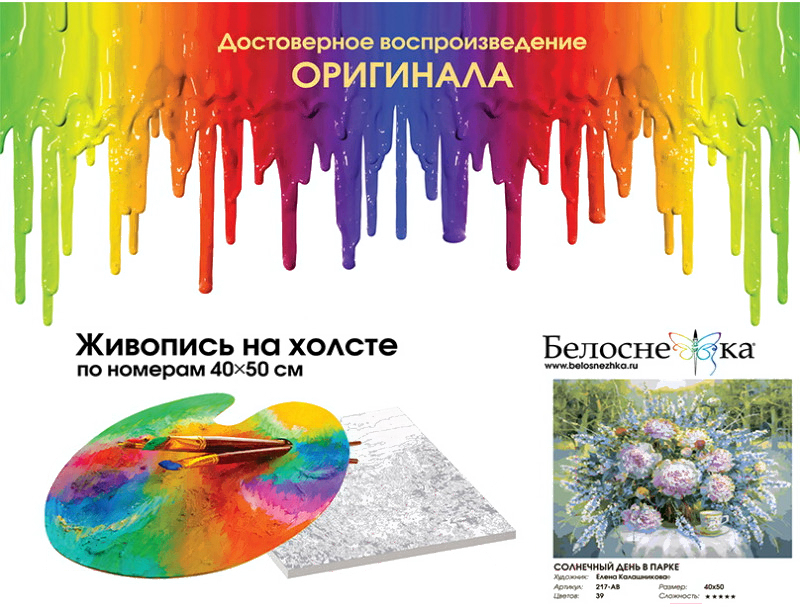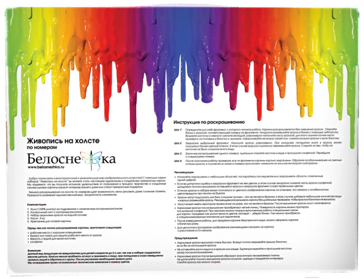 • Комплектация набора контрольный лист, холст, краски, кисти, инструкция, крепление, листовка о художнике