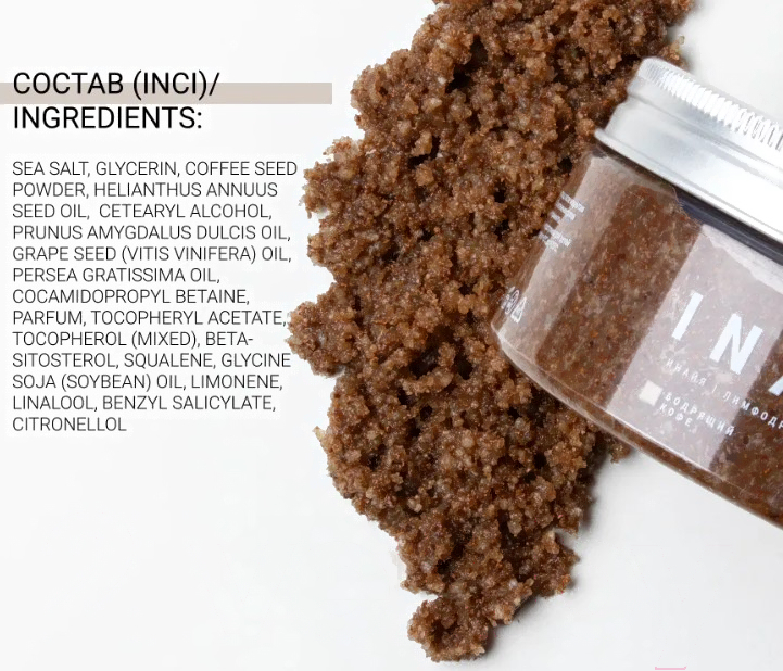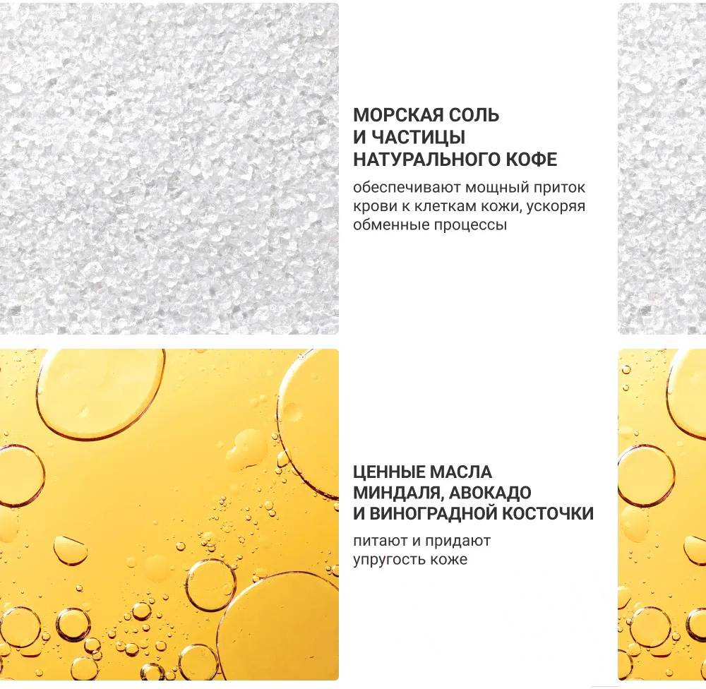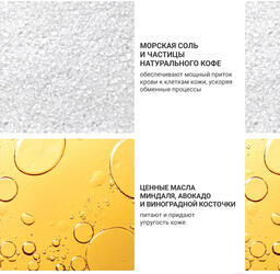 • Активные ингредиенты соль (морская), масло миндаля, масло авокадо, масло винограда, кофе