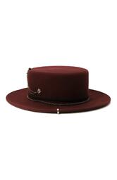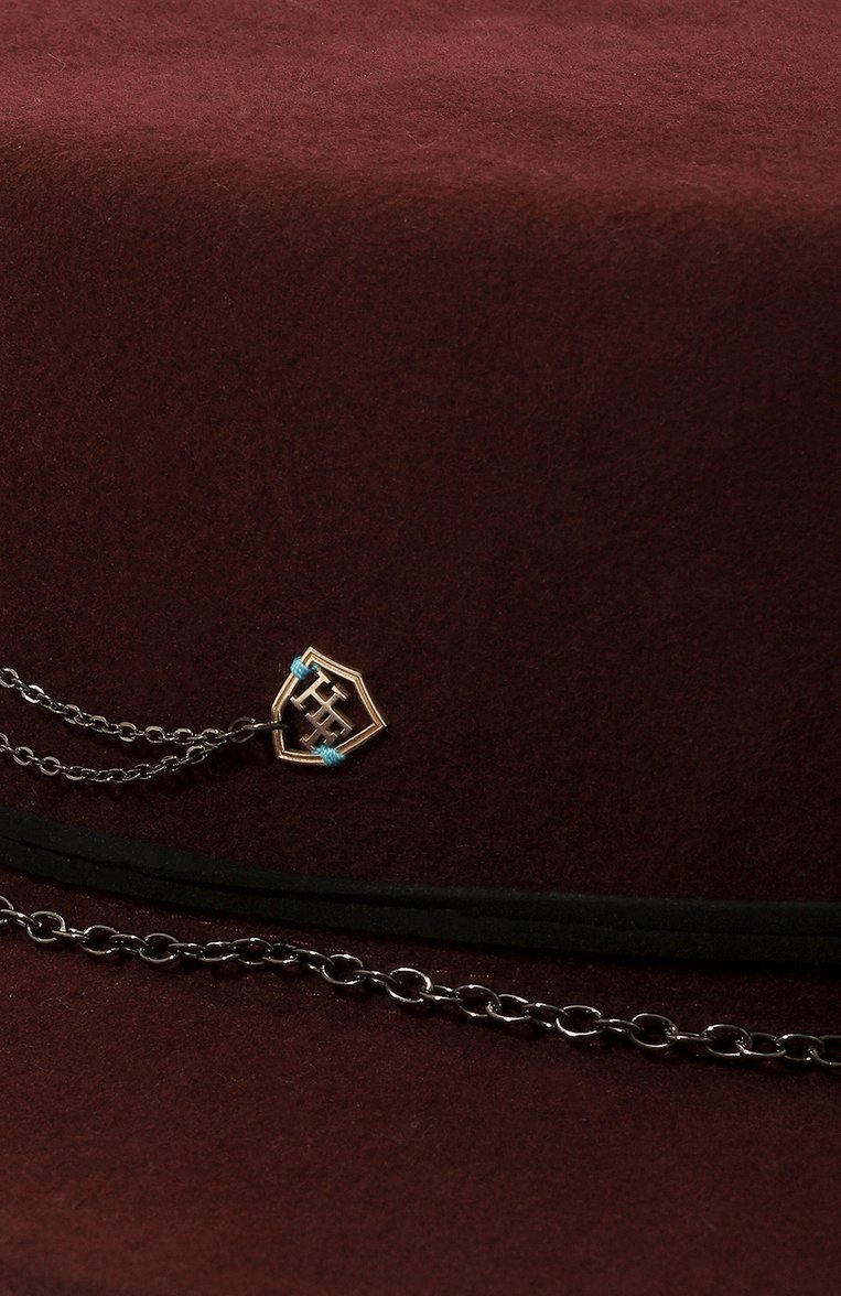 Фетровая шляпа Canotier станет идеальным завершением образа, например, с пиджаком в тон и кашемировым топом. Тулью изделия украсили металлическим подвесом с фирменной эмблемой, цепочкой и шнурком из эко замши, а прямые поля выделили тремя декоративными зажимами, напоминающими пирсинг.