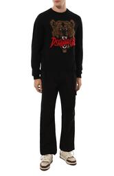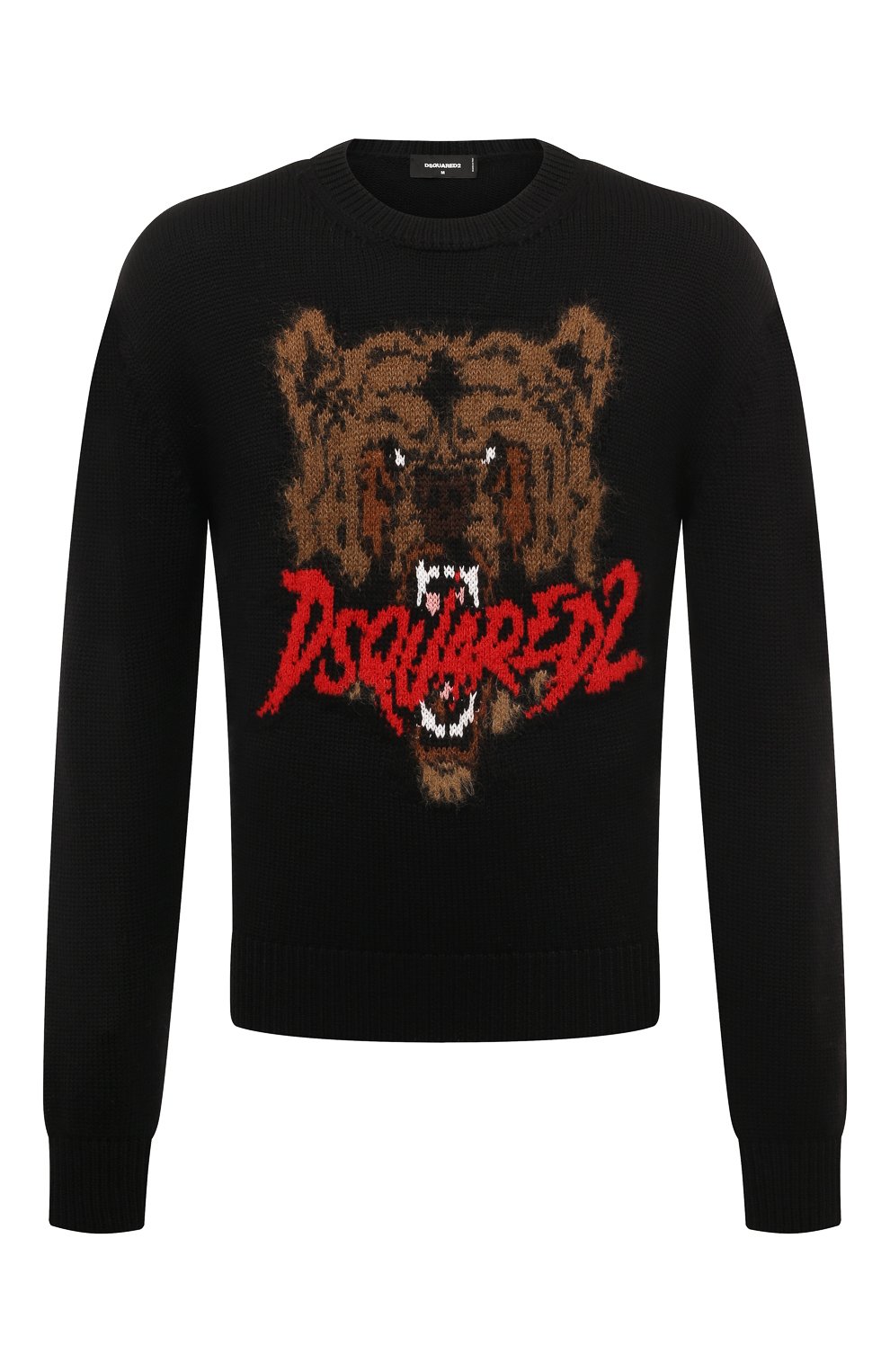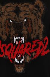 Свитер связан из мягкой шерсти Virgin, смешанной с мохером и хлопком. Модель из капсульной коллекции, вдохновленной хоррором Cocaine Bear, украшена спереди жаккардовым узором в виде головы рычащего медведя и логотипа марки.