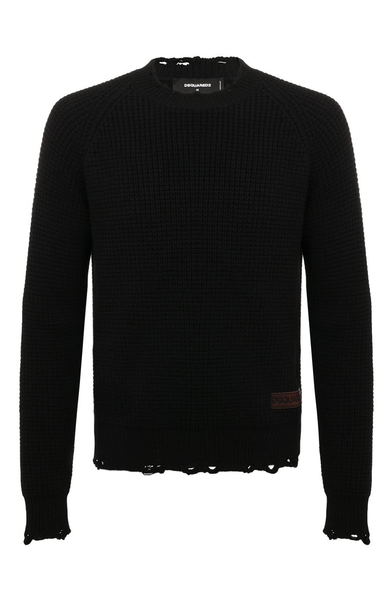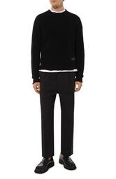 Свитеру с рукавами реглан придали состаренный вид с помощью декоративных потертостей и выступивших по краям нитей. Модель, связанную полупатентной резинкой из шерсти первого пострига, дополнили брендированным патчем из телячьей кожи.