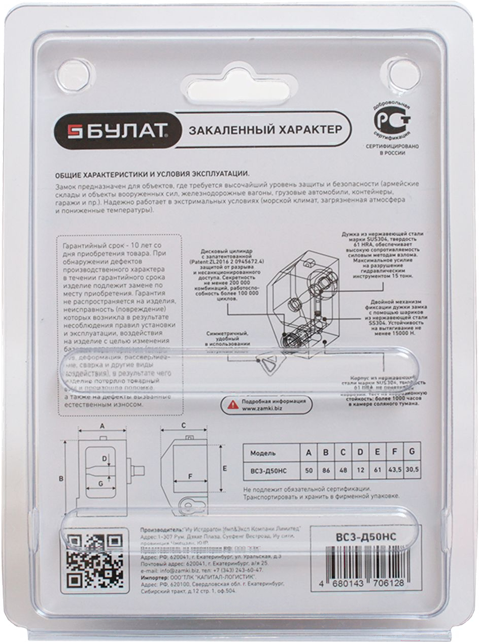 Замок навесной БУЛАТ ВС 3-Д50 НС (3 ключа)