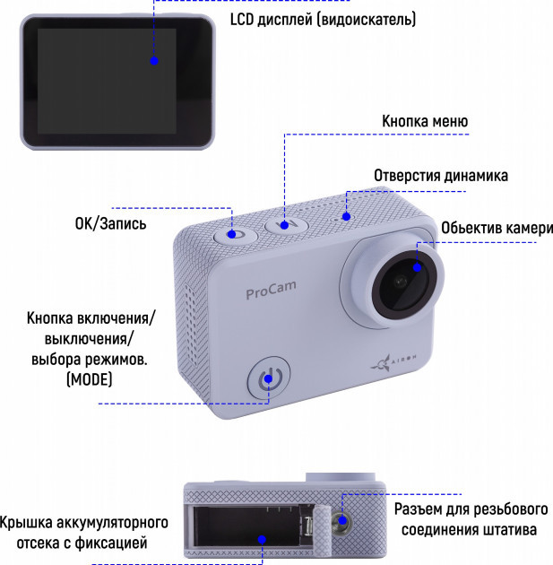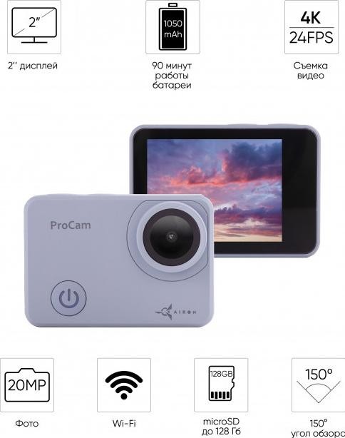 Нова екшн-камера AIRON ProCam 7 - це твоя можливість показати всьому світу те, яким він може бути барвистим і дивовижним. В твоїх руках всі можливі ракурси, тайм-лапси, зациклені і підводні відео і панорамні фото. Камера ідеально підходить для використання як в екстремальних умовах, так і більш спокійних. З нею тобі вдасться зафіксувати зачаровуючий захід, розкриття бутона, вируючий водоспад, занурення в підводний світ або їзду на мотоциклі, самокаті, роликах. Твоїм бажанням немає меж разом з компактним девайсом.