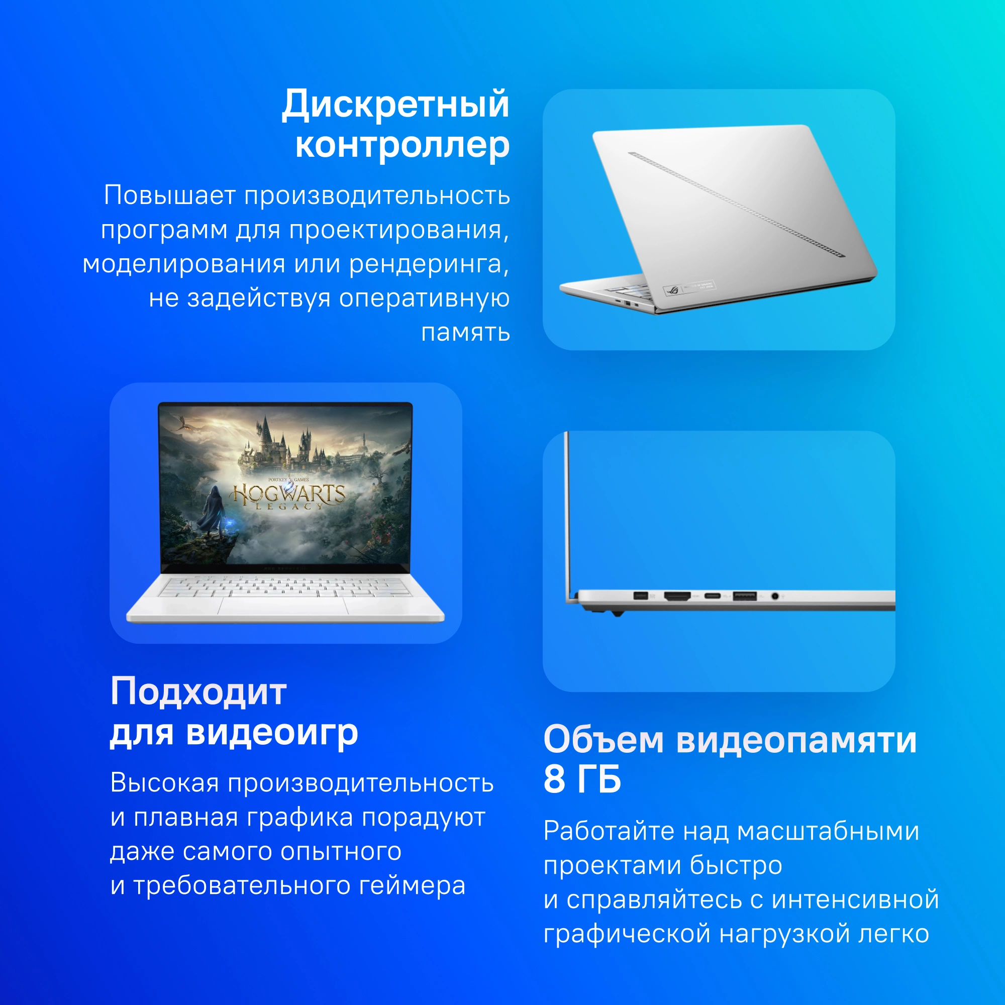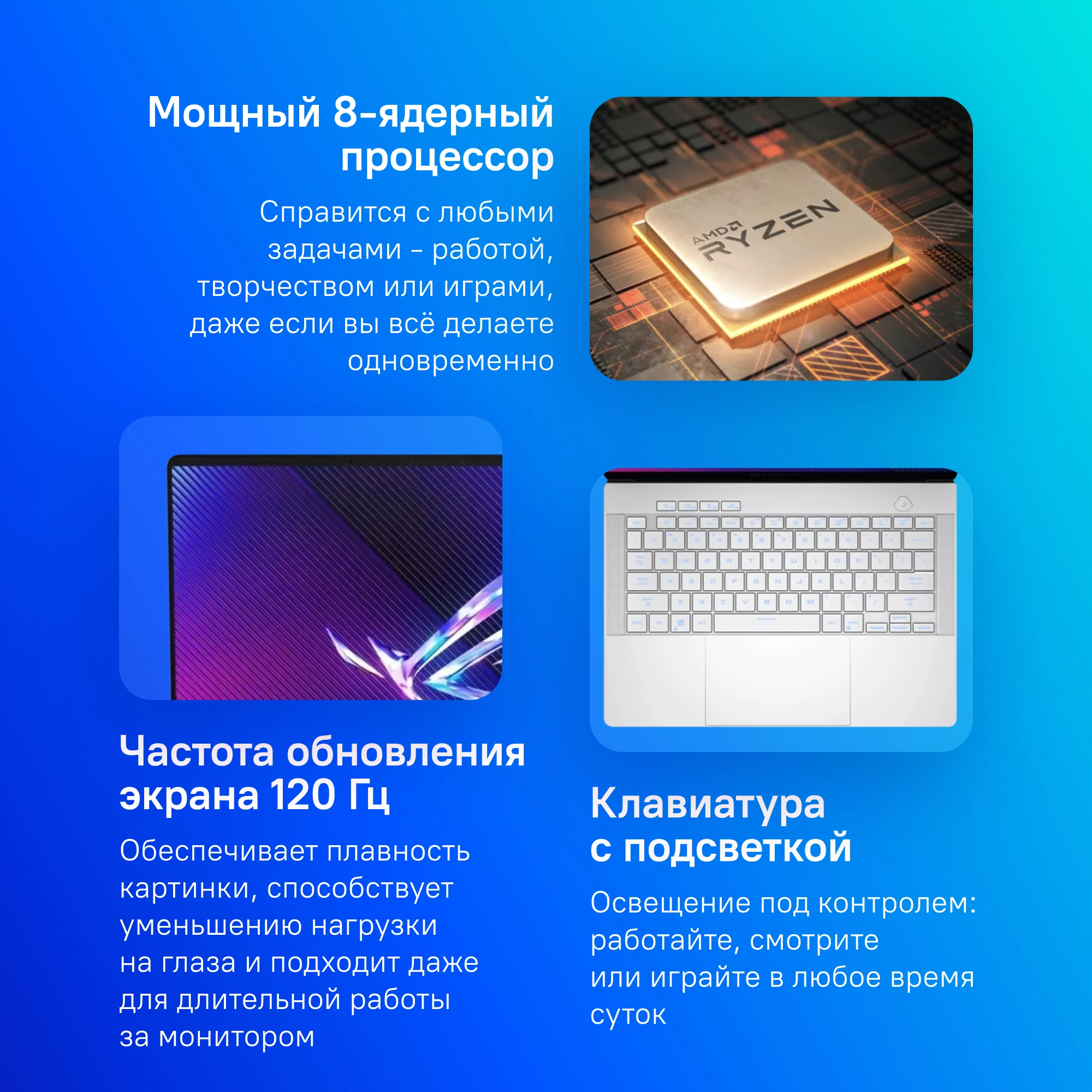 Ноутбук Asus ROG Zephyrus G14 GA403UI-QS094W Ryzen 9 8945HS 32Gb SSD1Tb NVIDIA GeForce RTX4070 8Gb 14" OLED 3K (2880x1800) Windows 11 Home white WiFi BT Cam (90NR0HX2-M004J0)