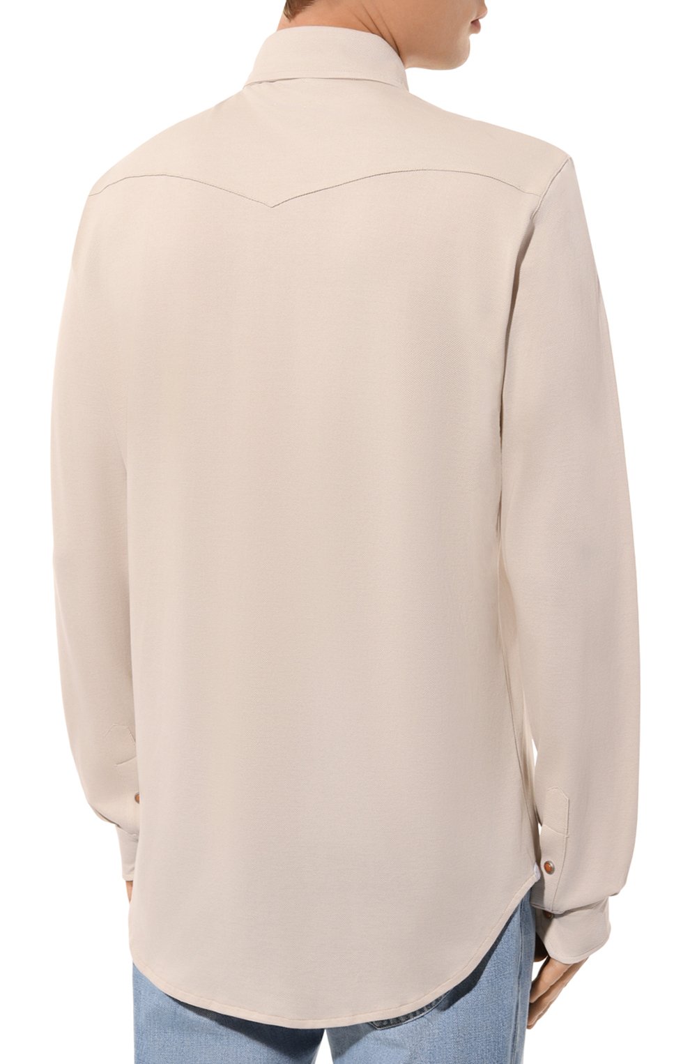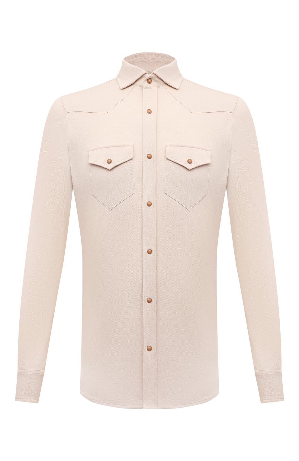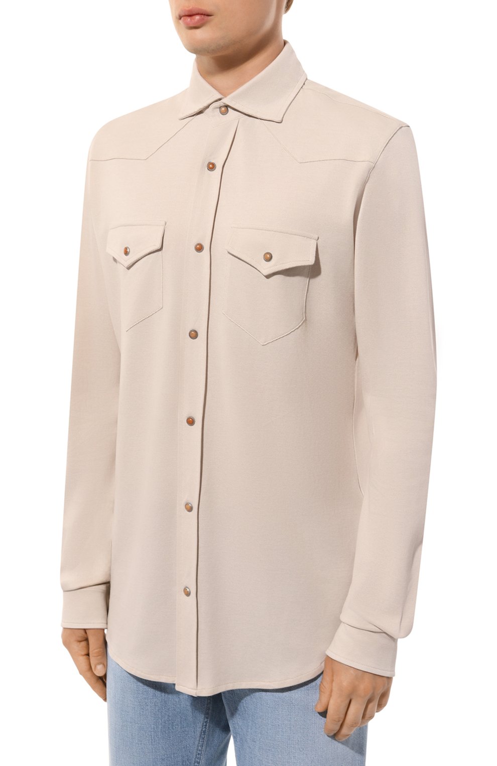 Рубашку в стиле вестерн сшили из бежевого трикотажа пике, для которого отобрали редкий египетский хлопок Giza с волокнами толщиной всего 2,8 микрона. Ценное сырье выращивают в ограниченном количестве в дельте Нила, собирают вручную и тщательно очищают от жестких включений, чтобы сохранить его природную нежность. Материал отличается не только мягкостью, но и прочностью, поэтому модель с нагрудными карманами долго будет выглядеть безупречно.