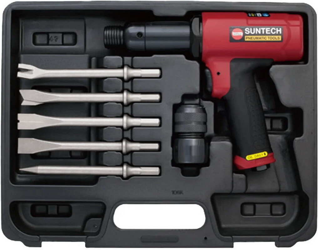 Пневмомолоток Suntech SM-128RK - это мощный и надежный инструмент для различных ударных работ, идеальный для автосервисов, строительных и производственных предприятий. Благодаря высокой частоте ударов и стабильному воздушному давлению, этот пневмомолоток способен справляться с широким спектром задач, включая резку, рубку и выбивание. Пневмомолоток Suntech SM-128RK сочетает в себе прочность и эффективность, что делает его отличным выбором для профессионального использования.
