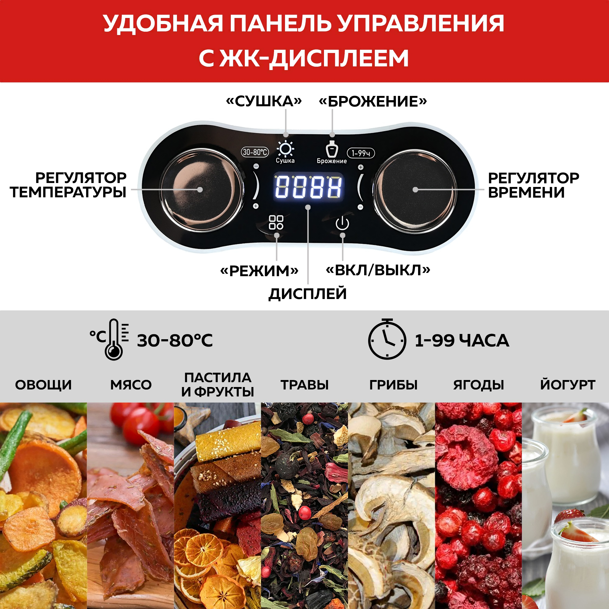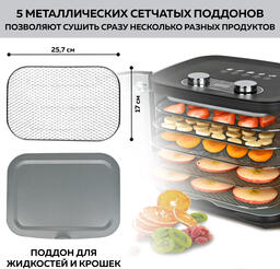 • Продукты для сушки овощи, фрукты, грибы, орехи, ягоды, зелень, мясо, рыба, хлеб , йогурт, тесто, специи, корнеплоды, изюм, цветы, лечебные травы, макароны, бобы, пастила, крупы