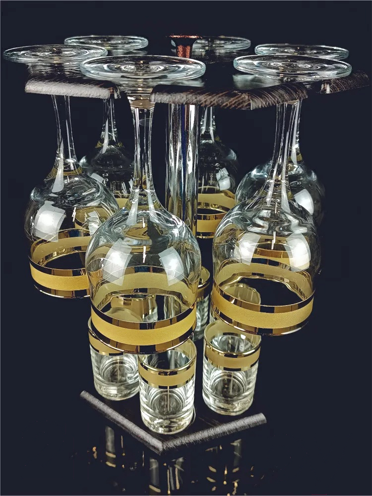 • Цвет золотистый (бокалы и стопки), прозрачный (бокалы и стопки), дерево (стойка)
