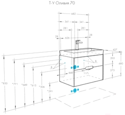 • Высота тумбы под умывальник 48 см