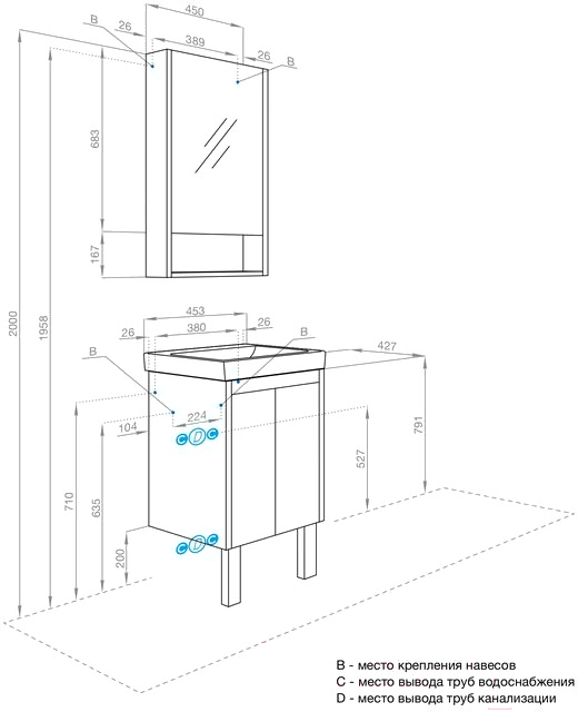 • Элементы набора тумба под умывальник (1 шт.), умывальник (1 шт.)