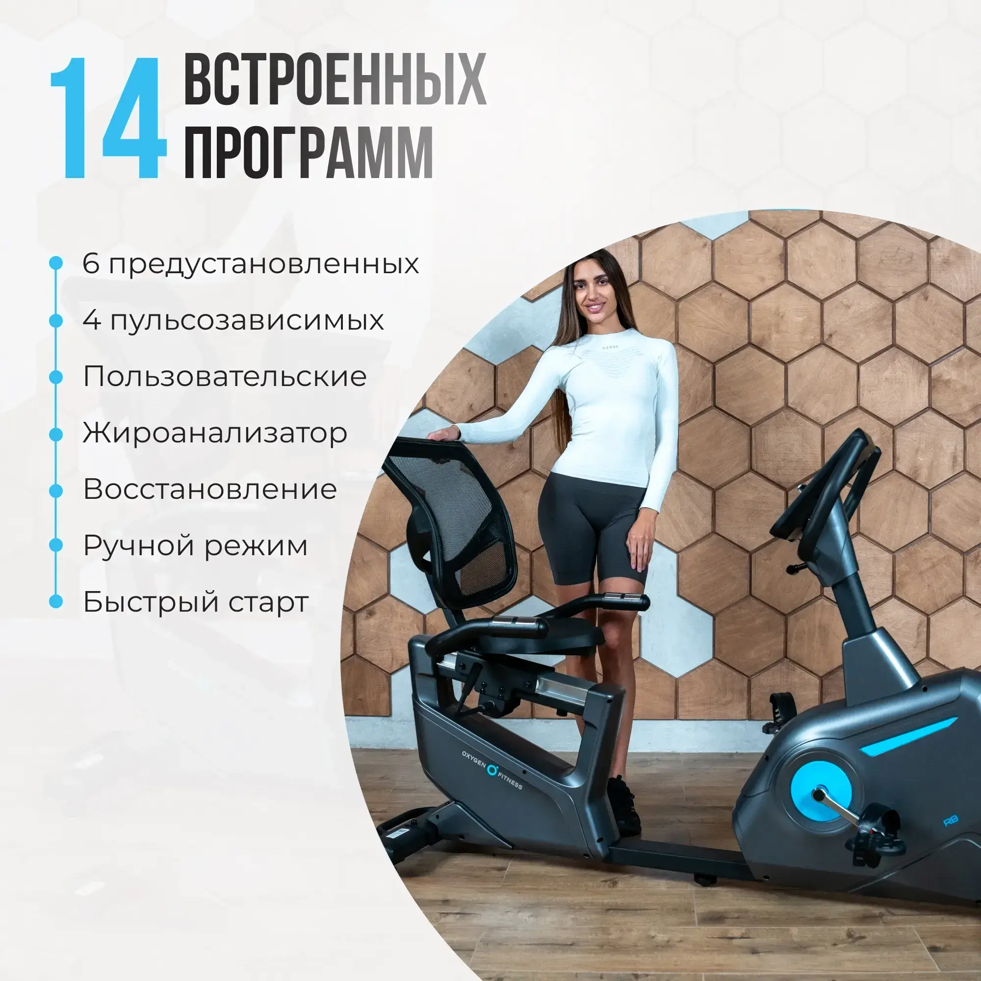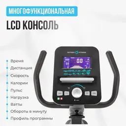 Индикацияпрошедшее время, текущая скорость, пройденное расстояние, сожжено калорий, пульс, уровень нагрузки, текущая программа, число оборотов в минуту, ватты
