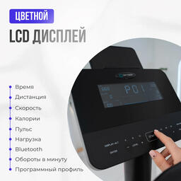 • Индикация уровень нагрузки, пульс, пройденное время, пройденное расстояние, расход калорий, текущая скорость, жироанализатор (Body Fat), профиль программ, частота вращения (об/мин)