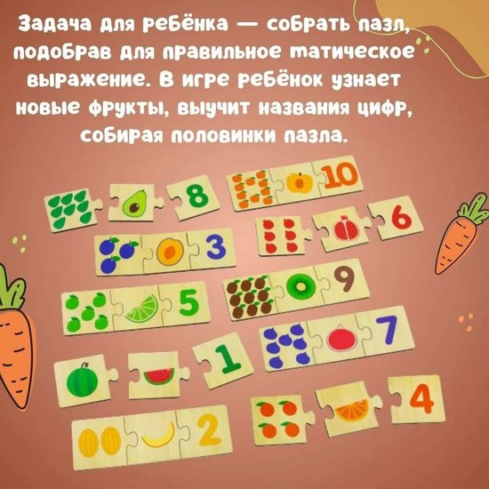 ✅ Развивающая игра Alatoys ПЗЛ32 представляет собой цифры и «разрез».✅ В комплект входят 30 деталей, которые необходимо соотносить между собой.✅ Нужно соотнести 3 разных дощечки: количество фруктов на дощечке с фруктом в разрезе и цифрой. В случае успешного выполнения, назовите фрукт, цвет и цифру вслух.✅ Соединить правильно.✅ Логическое сопоставление деревянных деталей поможет малышам развить навыки: логика, память, речь, моторику рук, воображение, счет, цветовое восприятие.✅ Развивающая игра Alatoys ПЗЛ32 представляет собой цифры и «разрез».✅ В комплект входят 30 деталей, которые необходимо соотносить между собой.✅ Нужно соотнести 3 разных дощечки: количество фруктов на дощечке с фруктом в разрезе и цифрой. В случае успешного выполнения, назовите фрукт, цвет и цифру вслух.✅ Соединить правильно.✅ Логическое сопоставление деревянных деталей поможет малышам развить навыки: логика, память, речь, моторику рук, воображение, счет, цветовое восприятие.