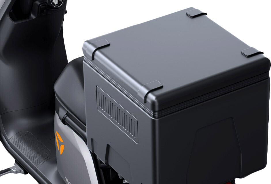 Электроскутер YADEA Y1S черного цвета отличается большой грузоподъемностью (до 210 кг) и неплохим запасом хода. Достичь запаса хода в 100 км удалось за счет двух аккумуляторов, емкостью 24 Ач. Сиденья рассчитано для двух пассажиров, позади есть небольшая полка-подставка для крепления багажа или чемодана, общим весом до 30 кг.