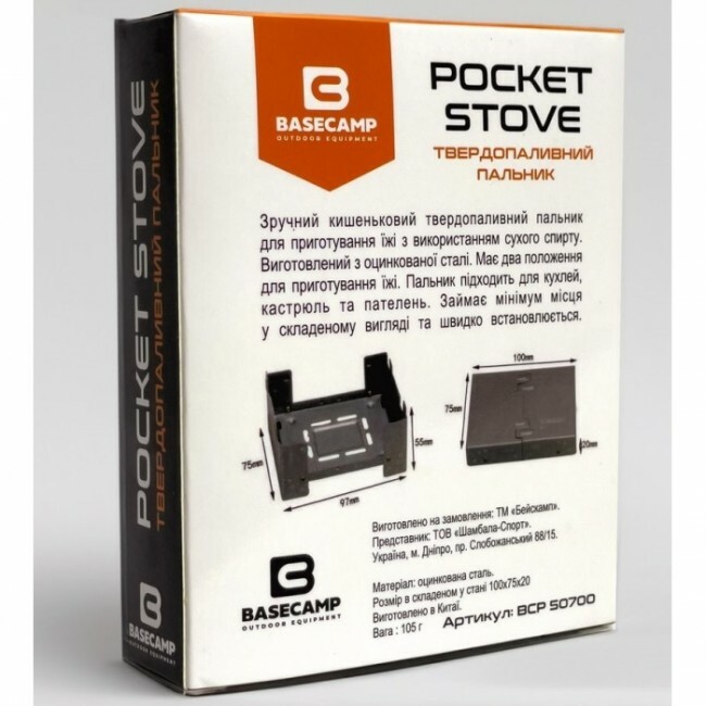 Горелка BaseCamp Pocket Stove - компактное и прочное решение для приготовления пищи в походах. Изготовленная из стали, легка в использовании. Ее складная конструкция делает ее удобной для туристов, занимая минимум места в рюкзаке. Быстро нагревается, обеспечивая эффективное использования в условиях ограниченного доступа к традиционным источникам тепла. Важно устанавливать ее на не горящую поверхность для безопасности. Характеристики: оцинкованная сталь, вес 105 г, размеры в разложенном состоянии 97х75х55 мм, идеальна для походов, где каждый грамм и сантиметр пространства ценны.