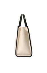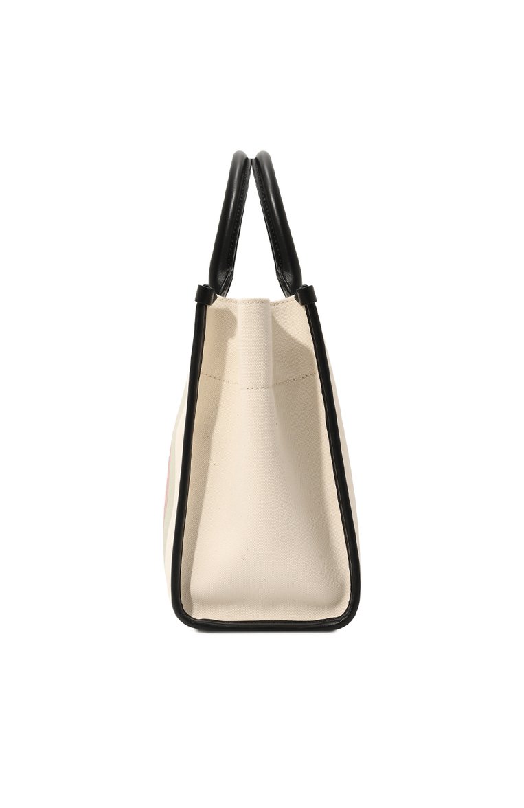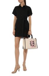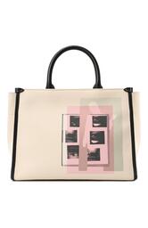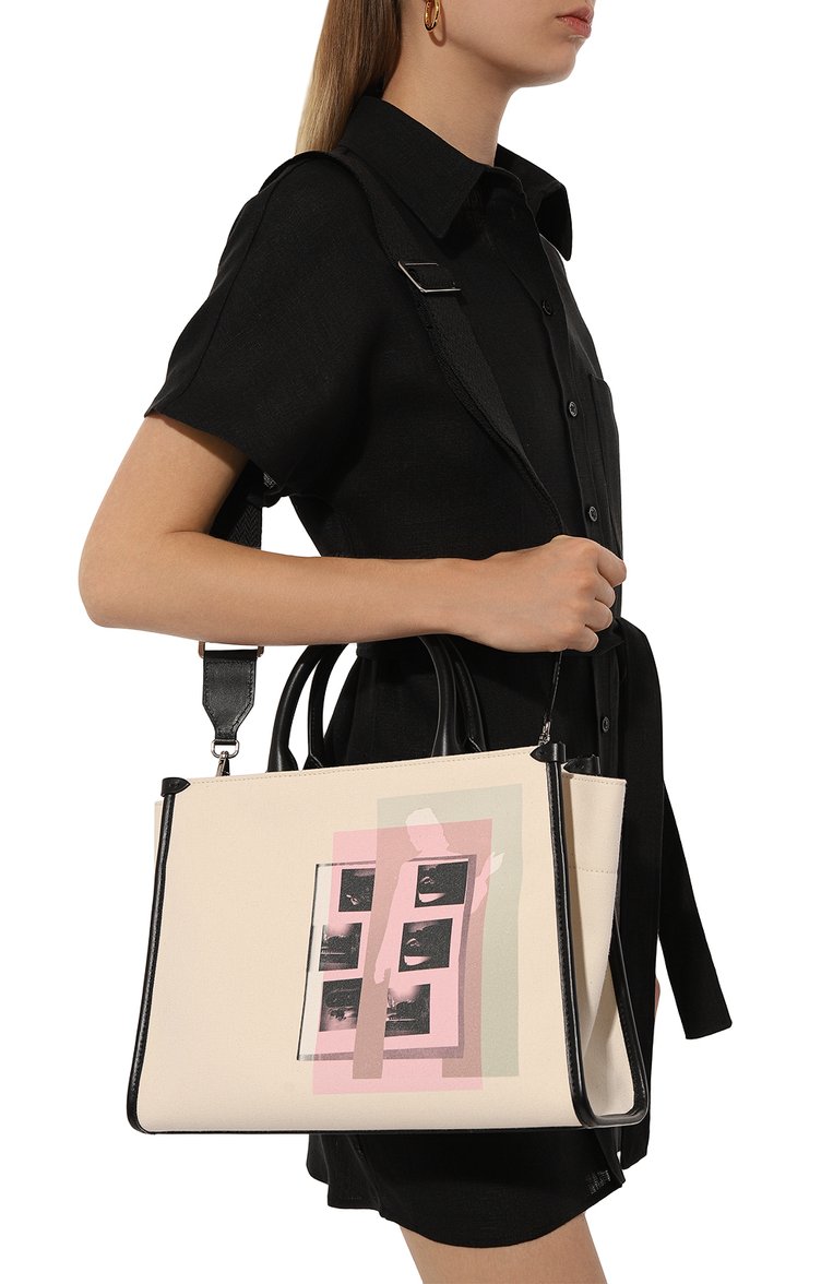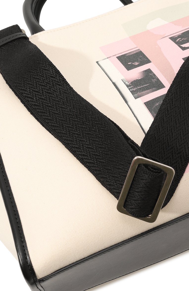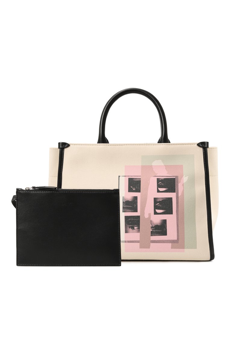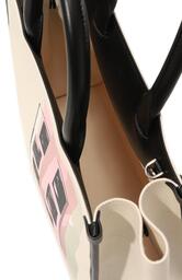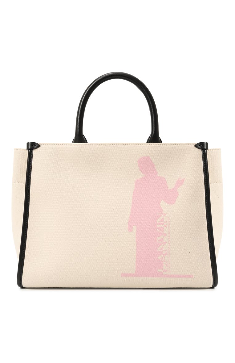 Вместительную сумку In&Out с функциональными кнопками по бокам сшили из прочного канваса. Аксессуар с двумя короткими ручками и съемным плечевым ремнем декорировали принтом из старинных фотокарточек и силуэта Жанны Ланван (чуть увеличенный в размере он есть и на задней панели).