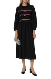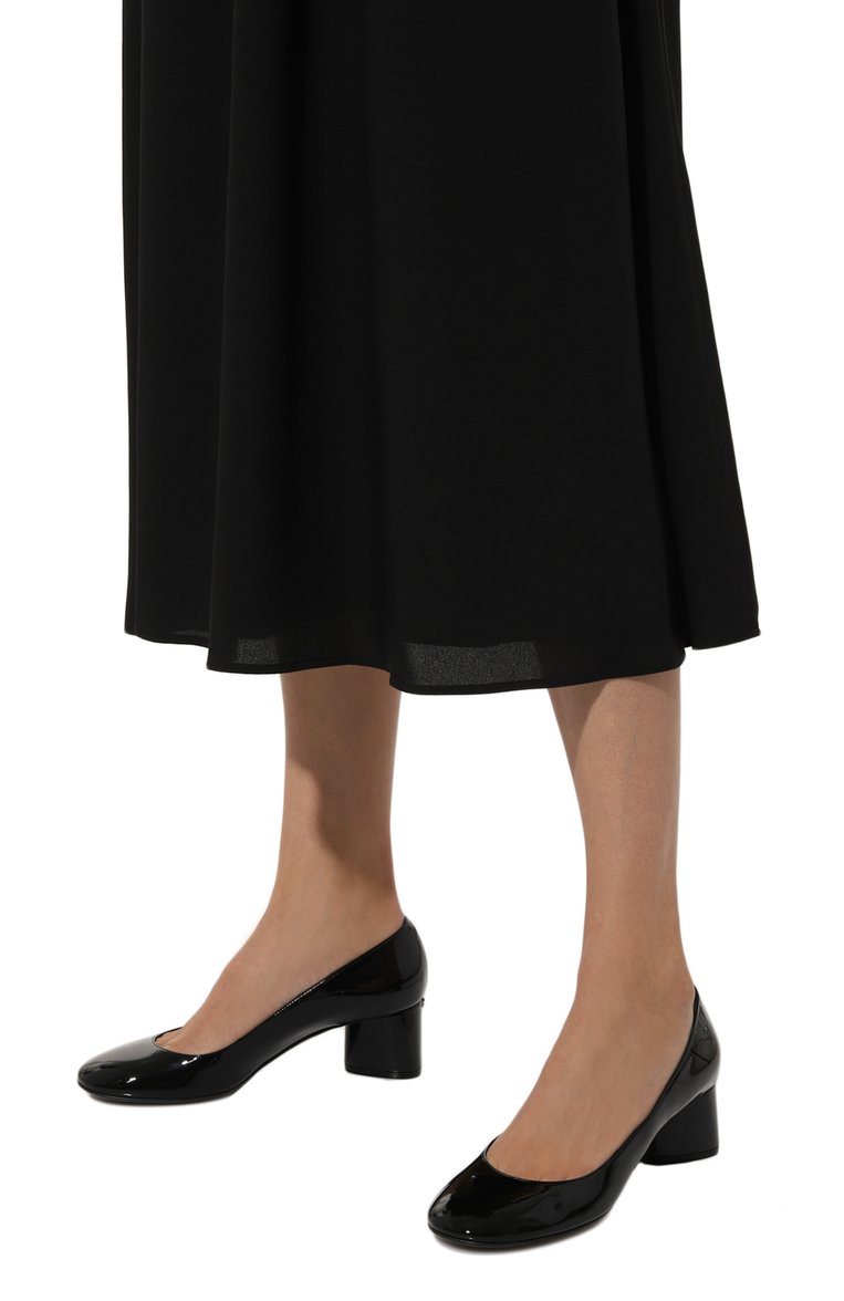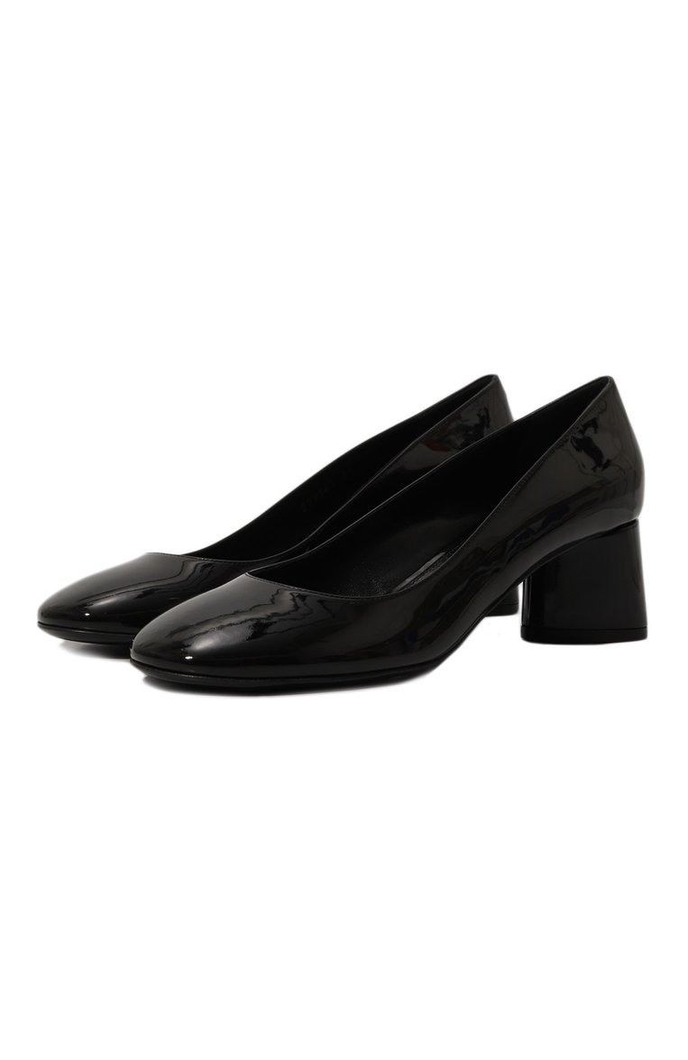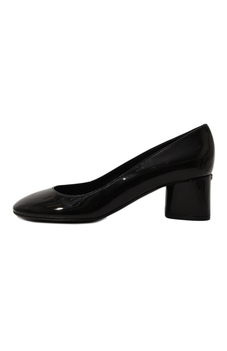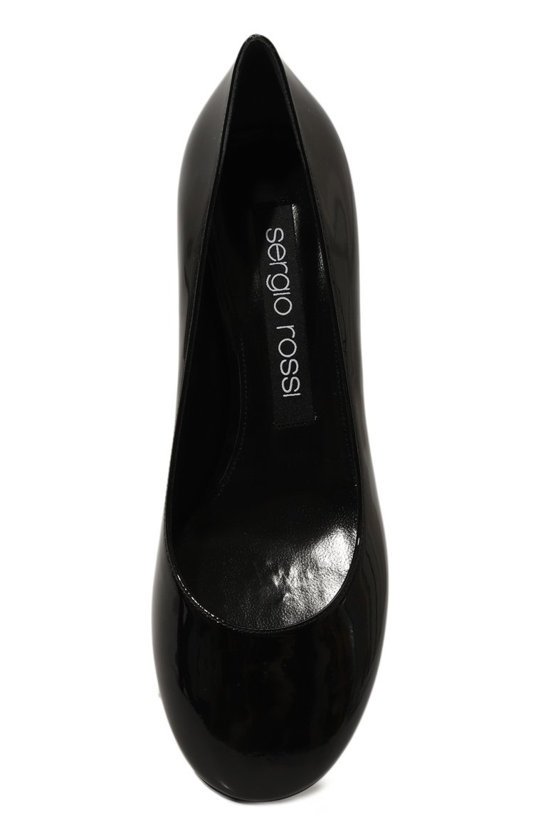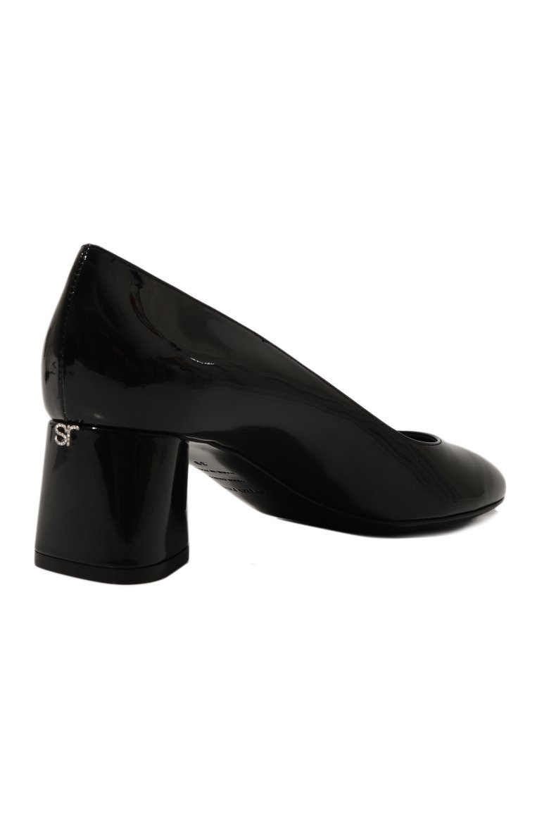 Туфли sr Pilier с круглым мысом выполнили из гладкой телячьей кожи с глянцевым лаковым покрытием. Пару поставили на невысокий устойчивый каблук, декорированный сзади монограммой SR из сверкающих кристаллов.