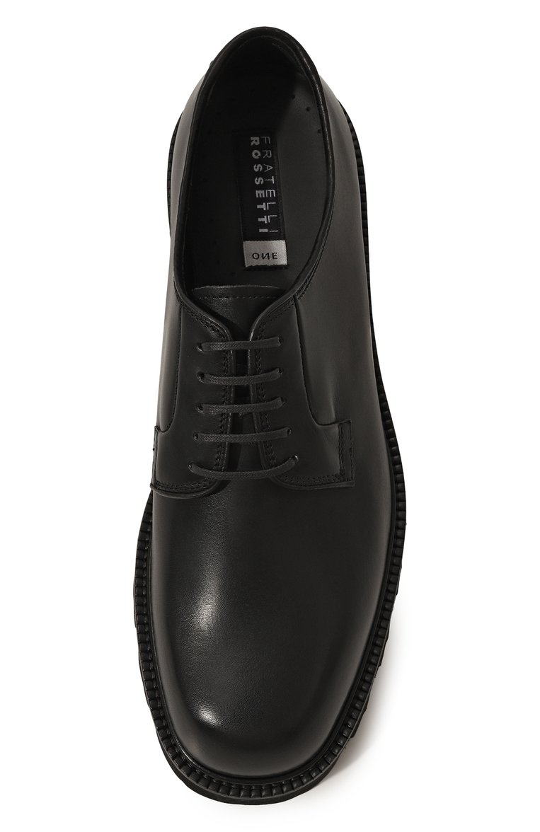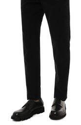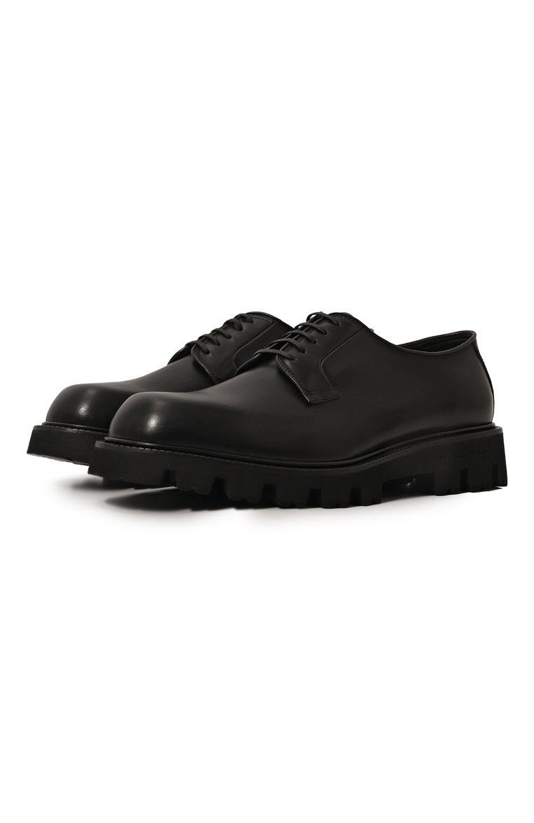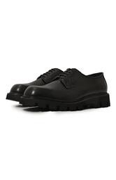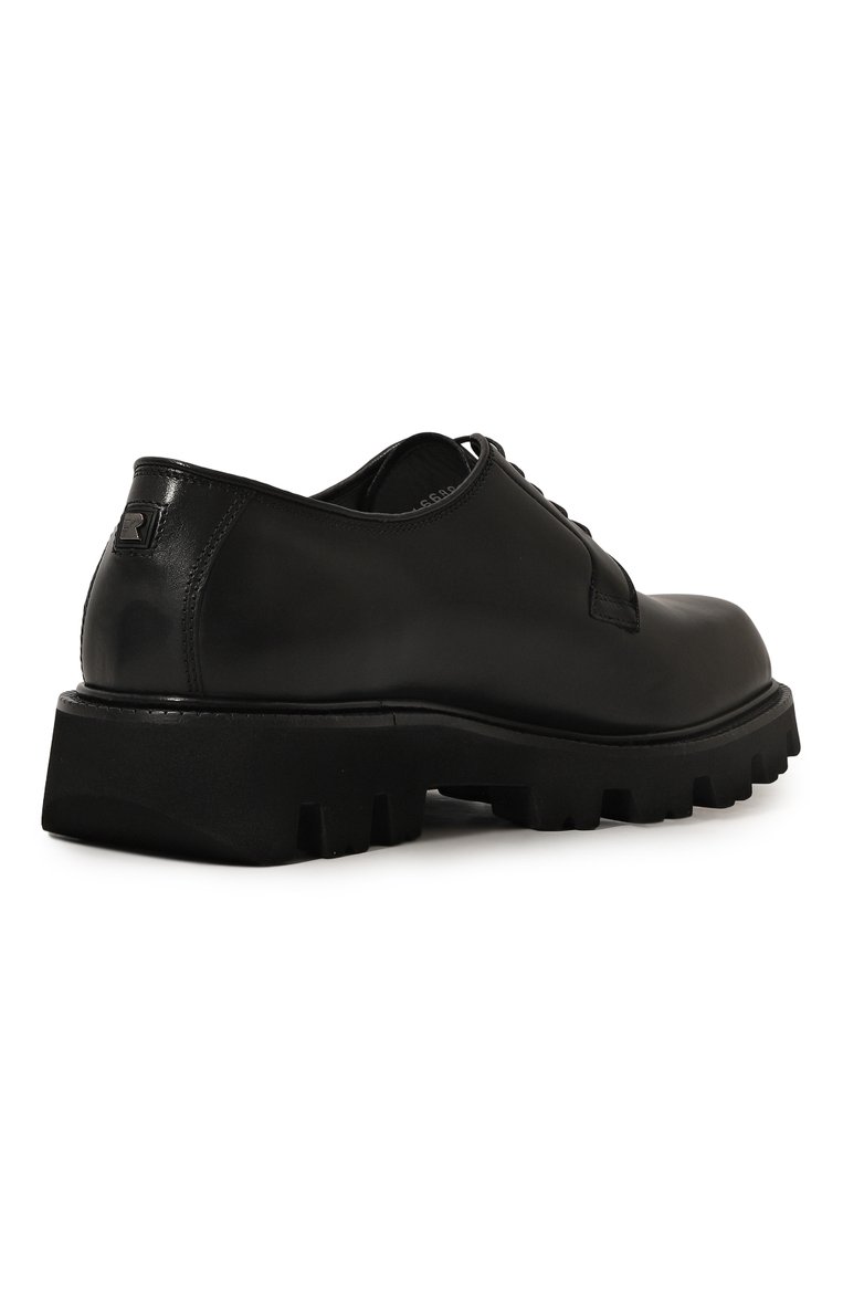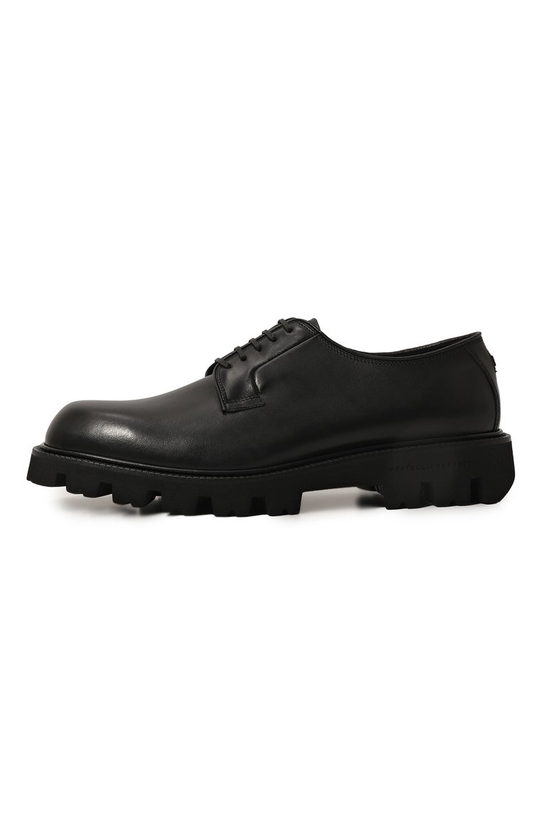 Широкая протекторная подошва, как у трекинговой обуви, делает менее формальными эти черные дерби. Для изготовления модели с серебристой накладкой-эмблемой на заднике использовали гладкую полированную кожу.