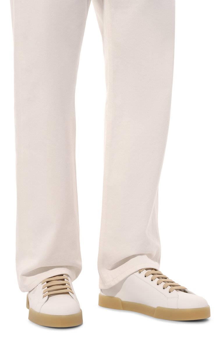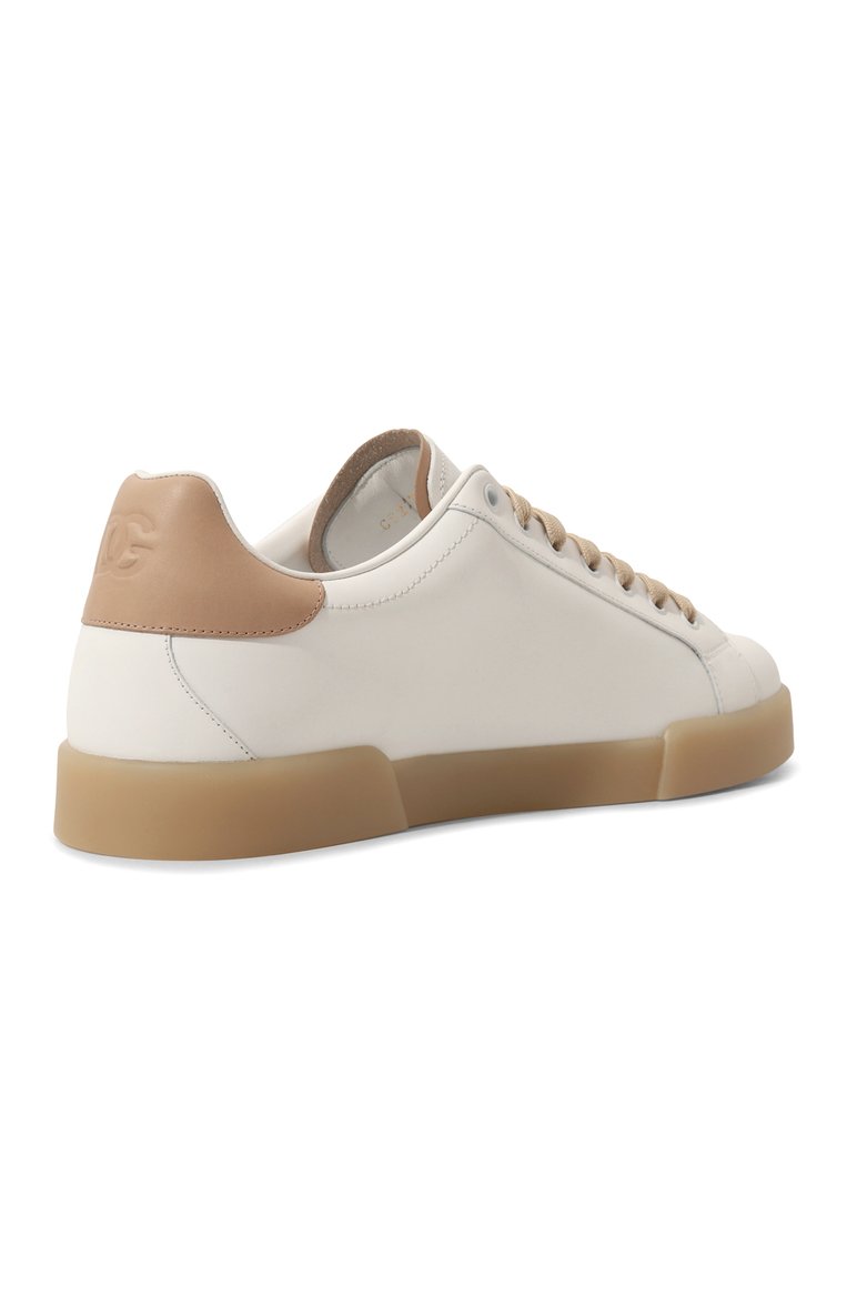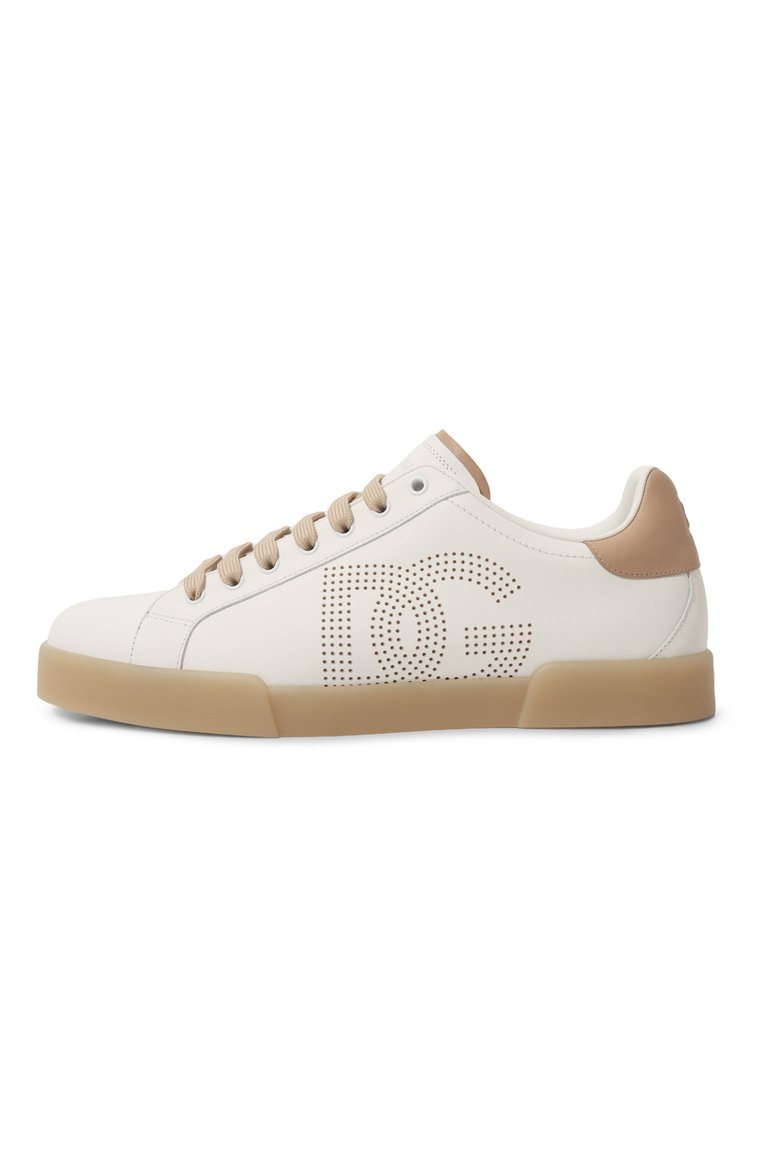 Боковые панели кожаных кедов Portofino украсили перфорированным узором в виде монограммы DG. Символ бренда также оттиснули на контрастном заднике, а язычок дополнили едва заметным логотипом.
