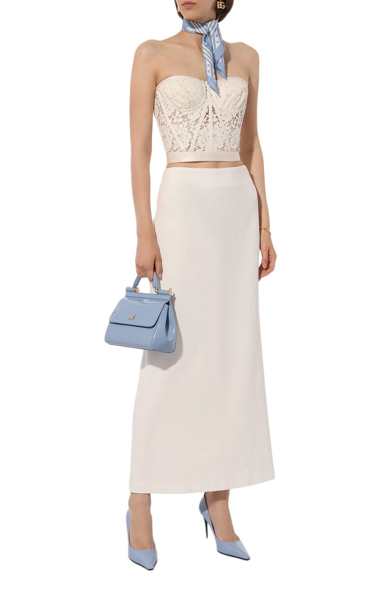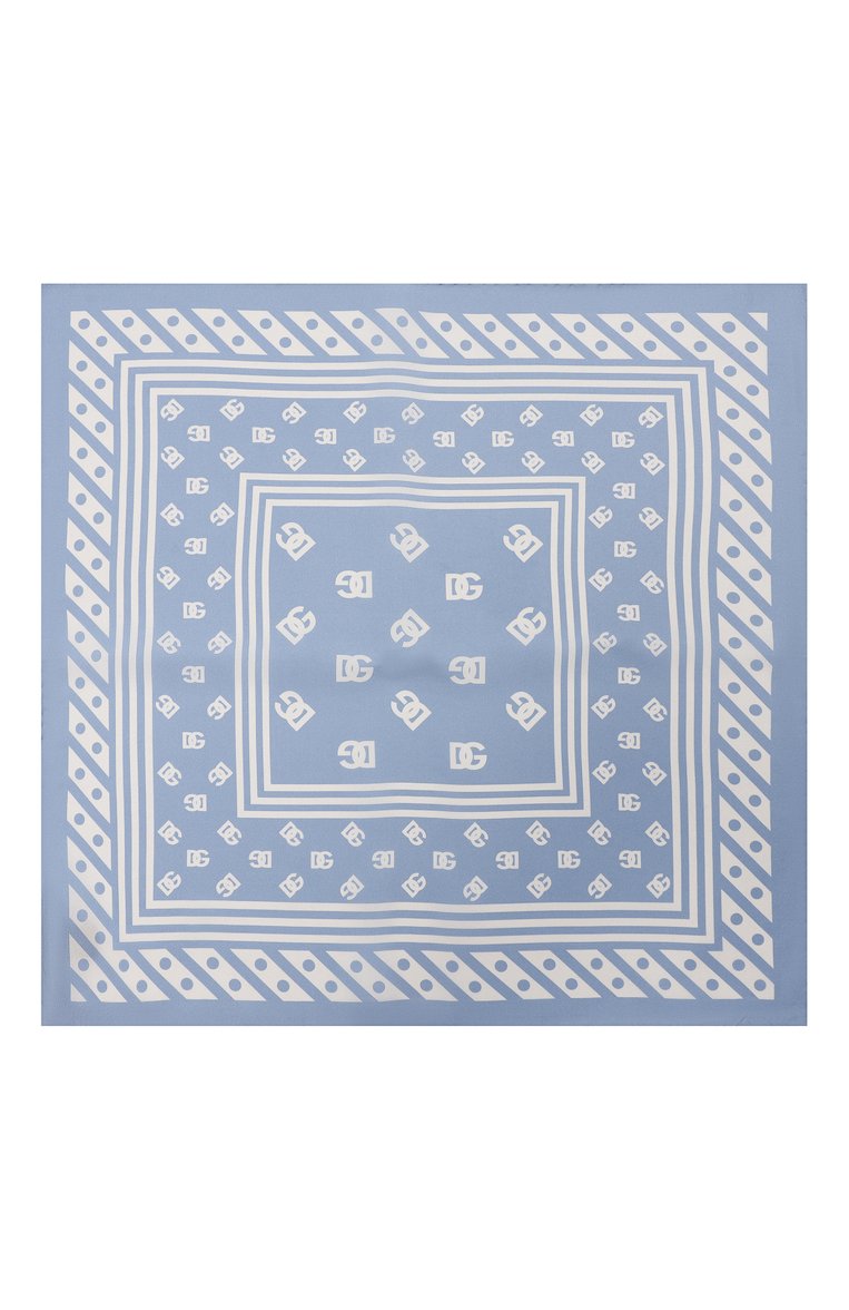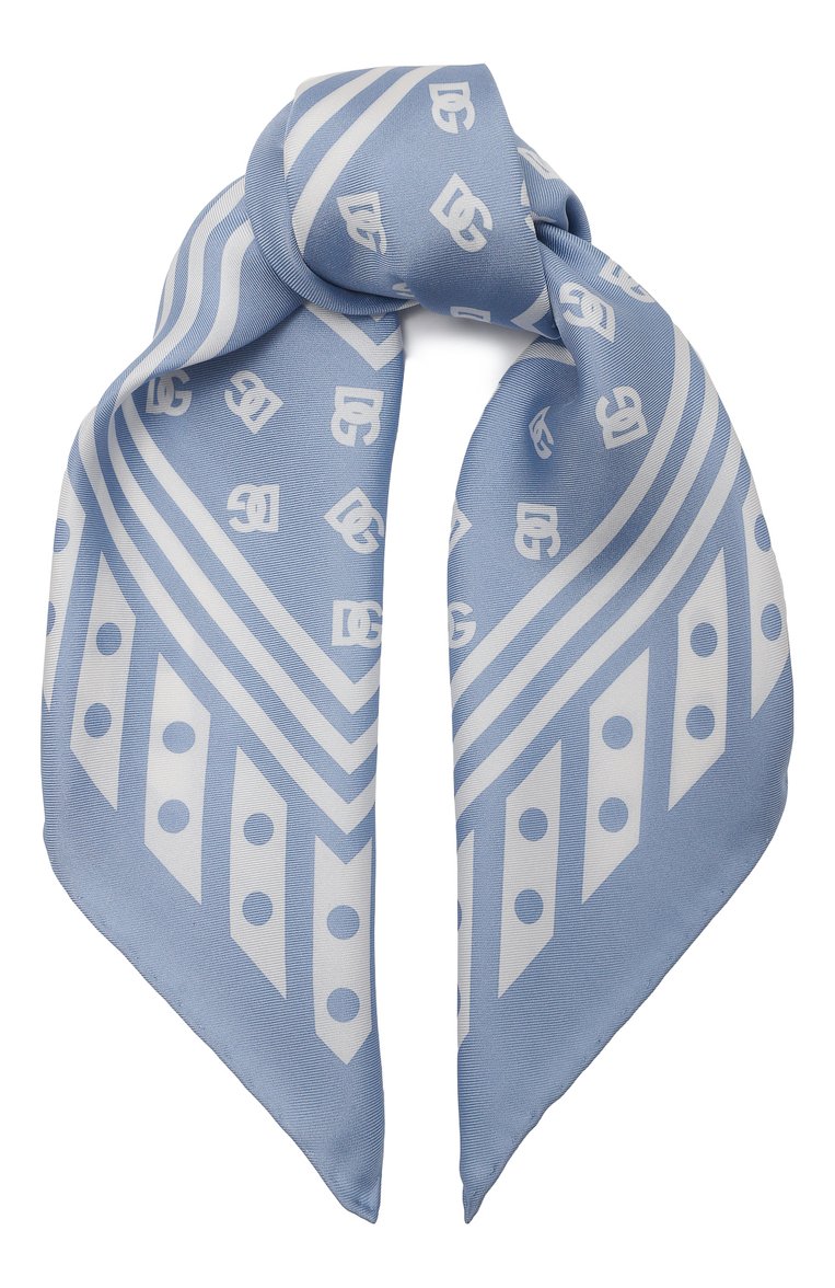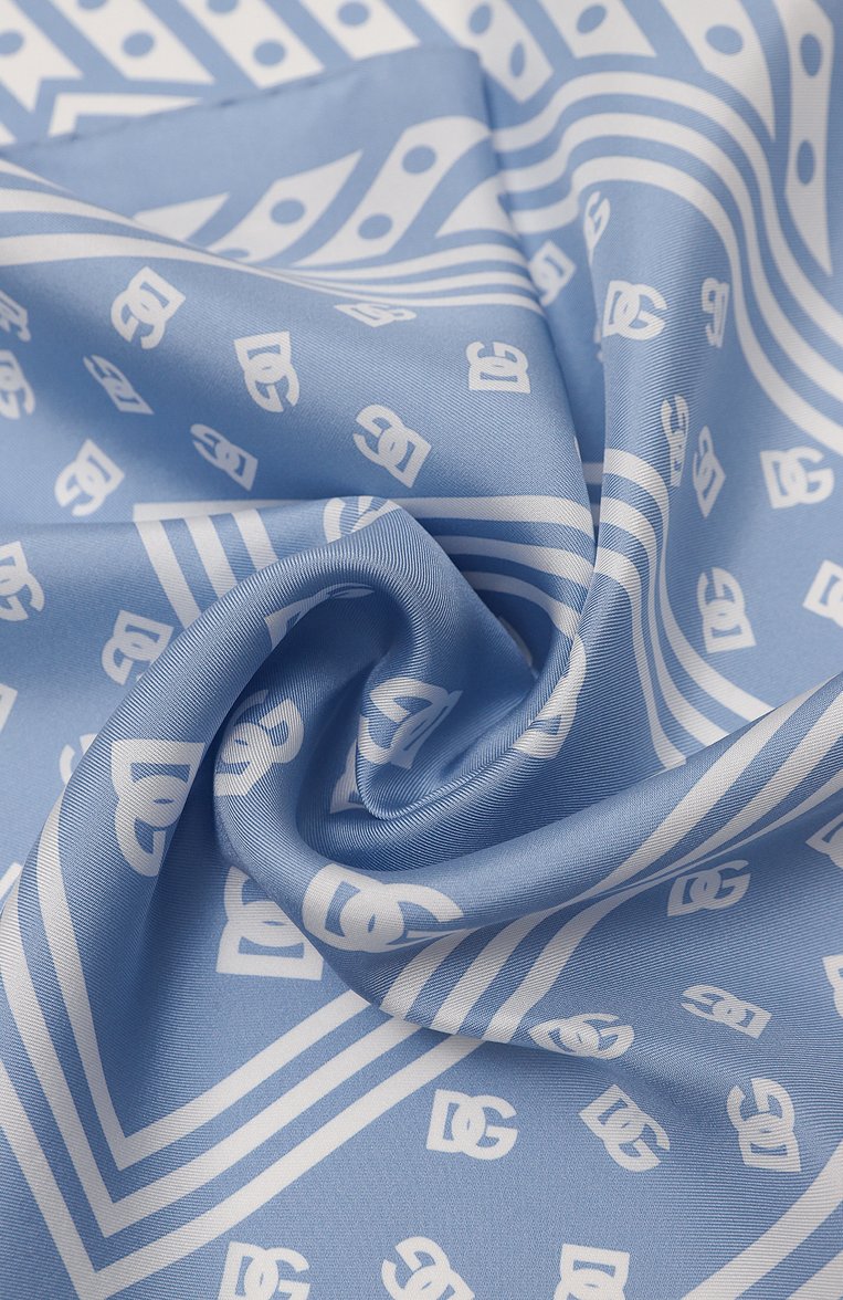 Небольшой платок с геометрическими мотивами и паттерном из монограммы DG выполнили из шелкового твила. Аксессуар легко стилизовать разными способами, например, повязать на ручку сумки, низкий хвост или вместо галстука.