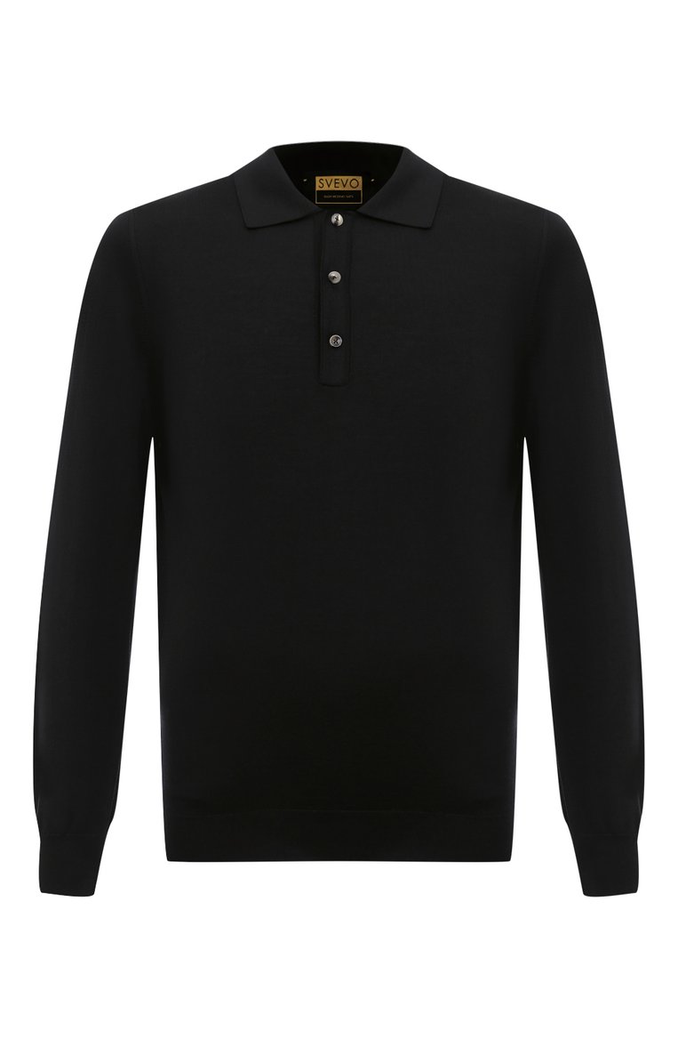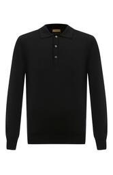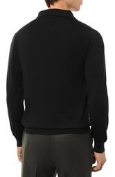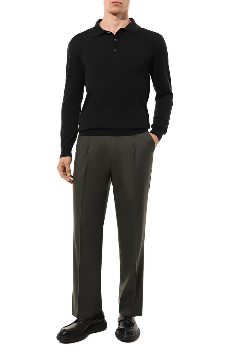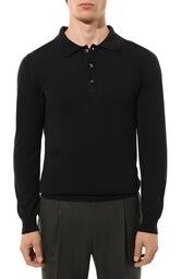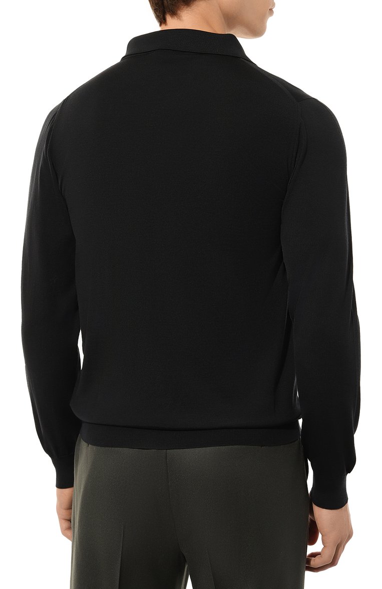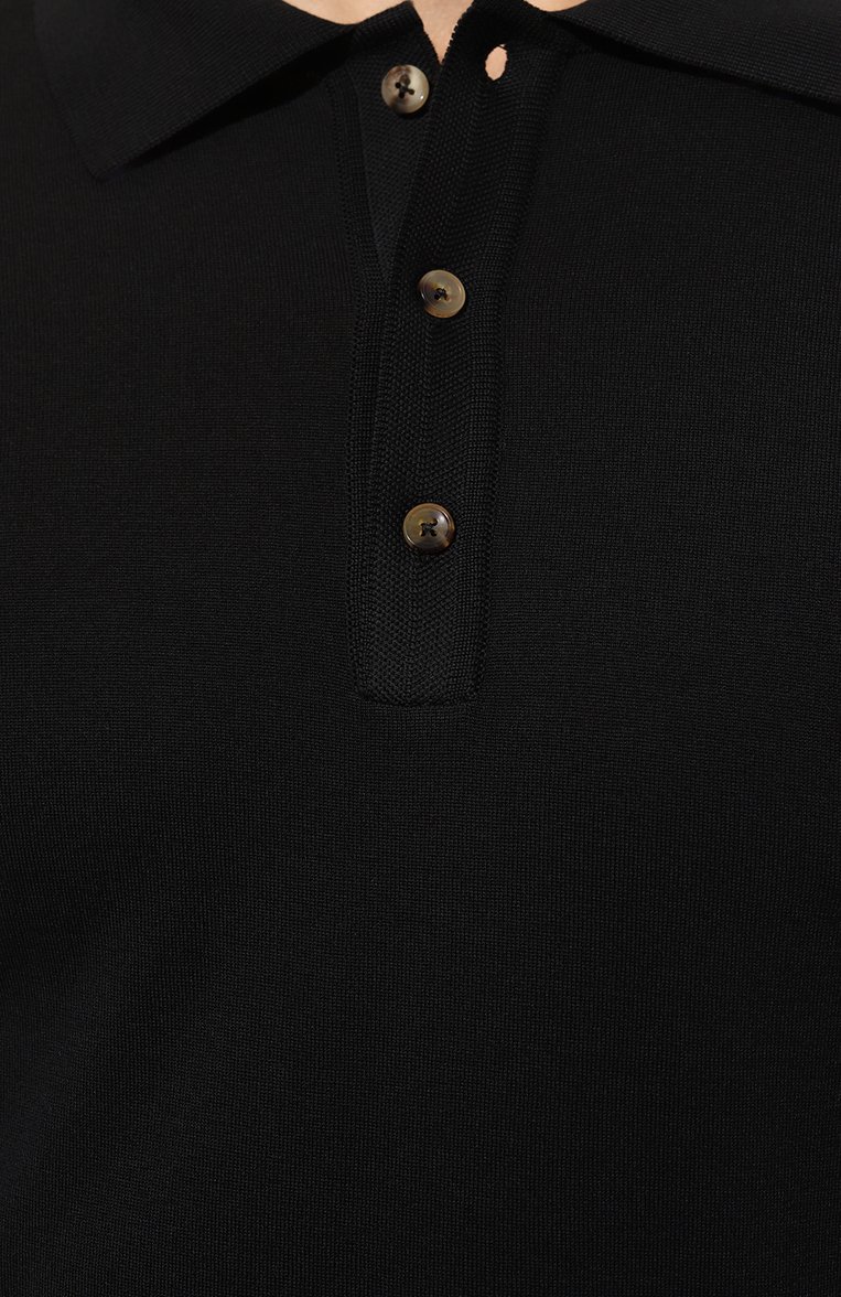 Черное поло станет идеальным дополнением образа в стиле smart casual. Полуприлегающую модель выполнили из тонкой шерсти. На короткой пуговичной планке расположили ряд роговых пуговиц.