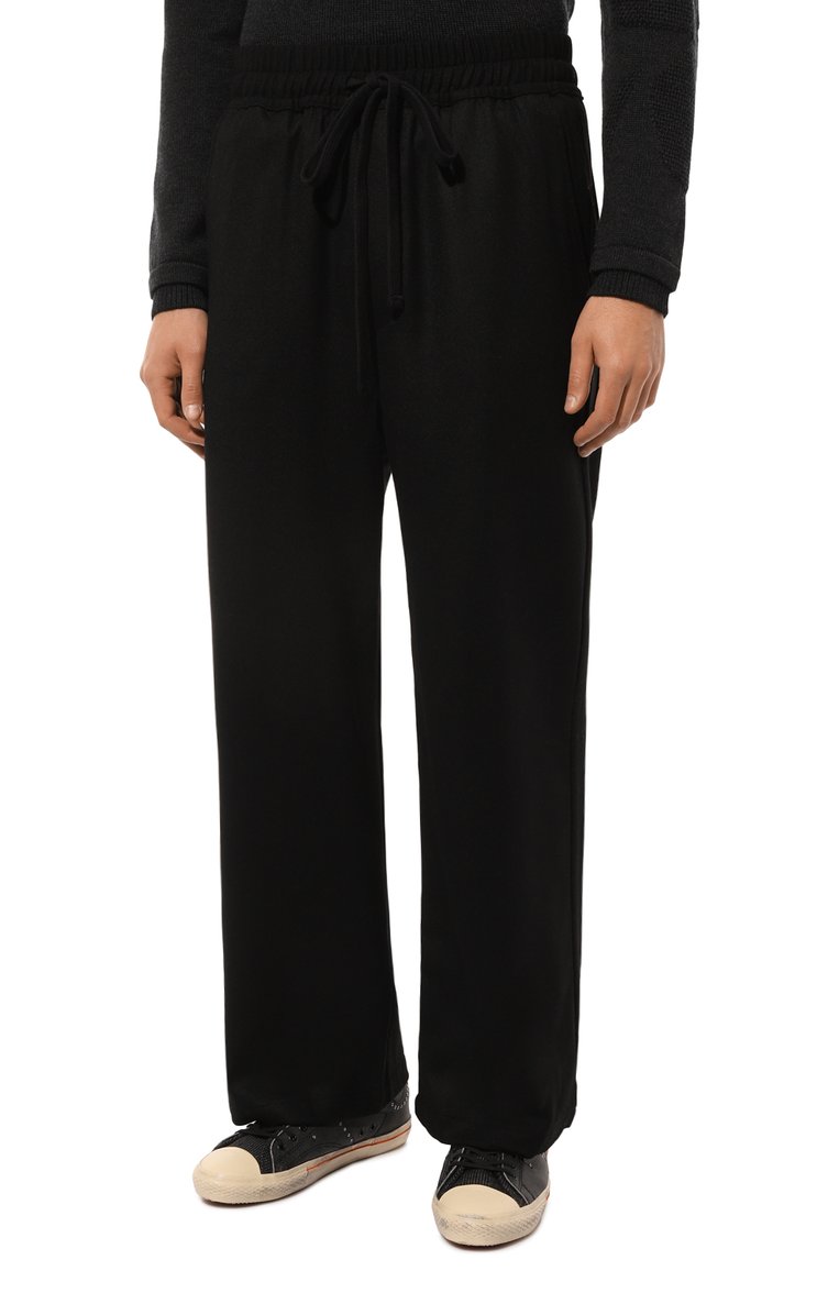 Для изготовления свободных брюк с заниженным шаговым швом и эластичным поясом-кулиской использовали шерстяную фланель стрейч. Помимо боковых карманов, изделие дополнили тремя задними: двумя врезными и одним накладным.