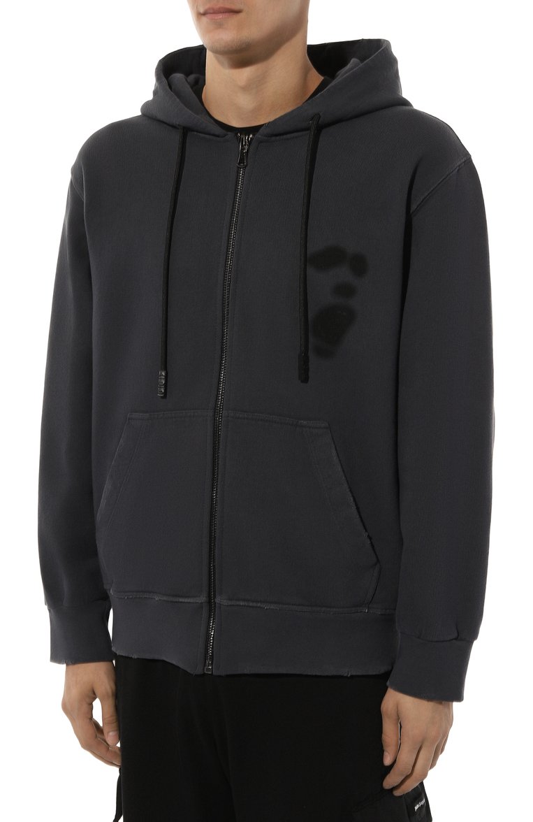 Визуально состаренная толстовка с объемным регулируемым капюшоном и двумя накладными карманами выполнена из хлопкового трикотажа. Модель силуэта oversize украшена спереди размытым принтом-эмблемой, а сзади — вышитым рельефным логотипом марки.