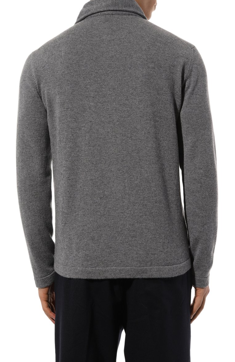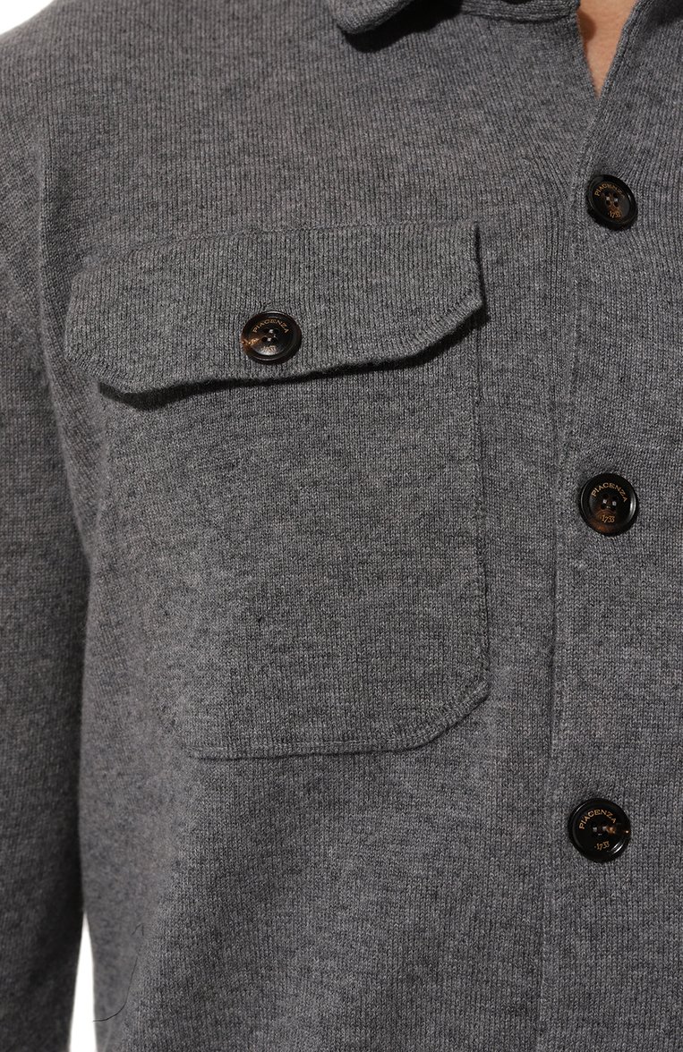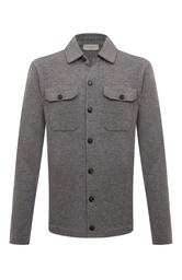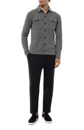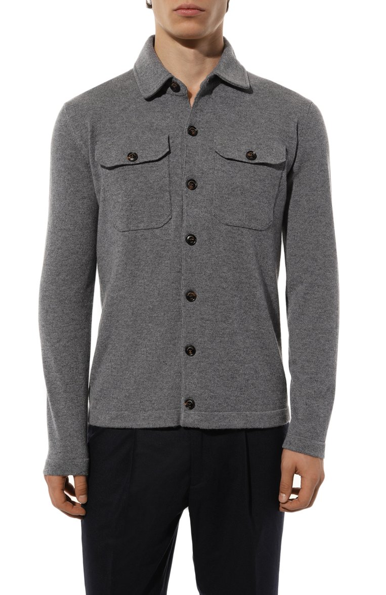 Меланжевая рубашка с отложным воротником одинаково хорошо дополнит и комплект для офиса с нестрогим дресс-кодом, и образ для паба. Модель с двумя накладными карманами с клапанами связали из кашемировой пряжи.