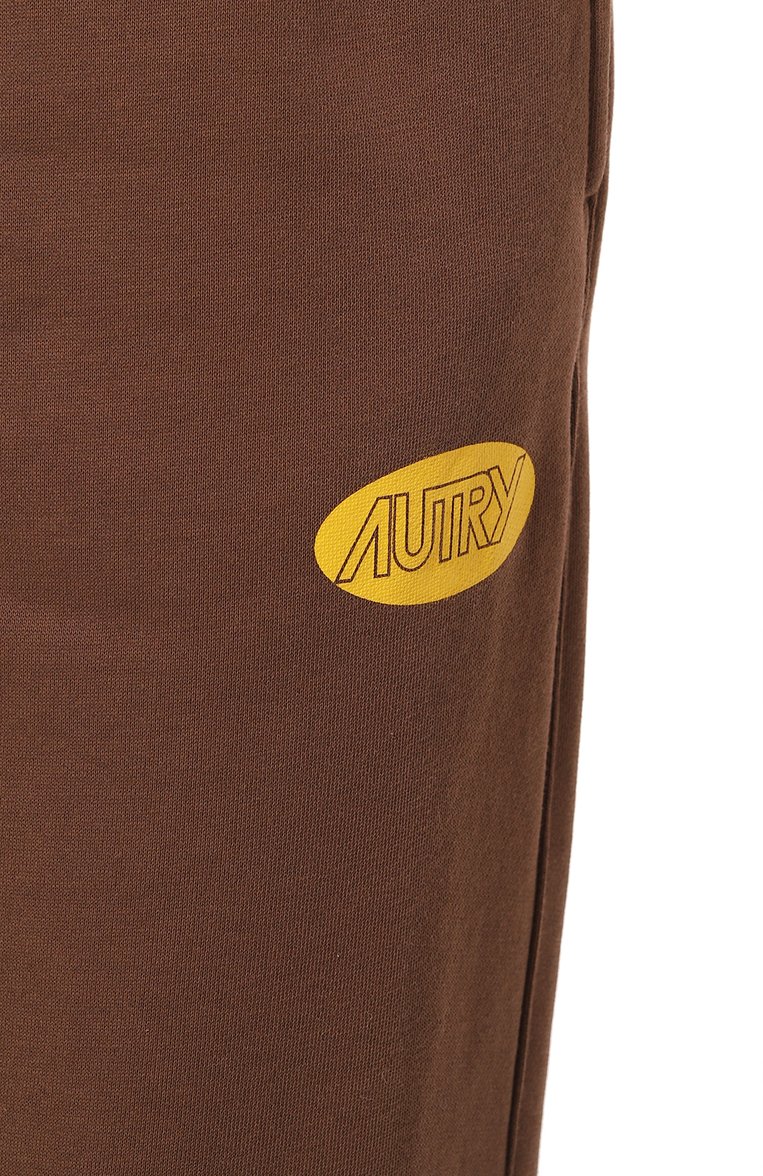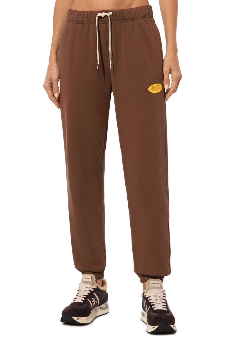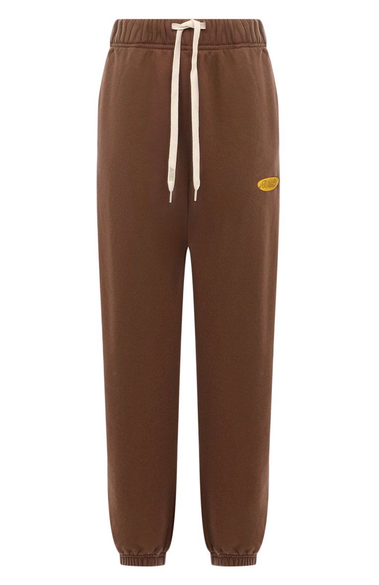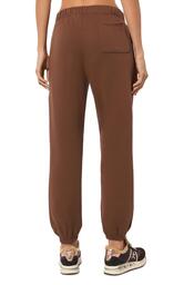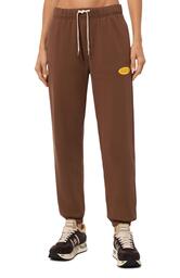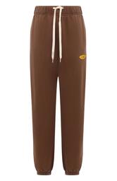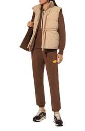 Для пошива джоггеров с тремя карманами использовали хлопковый трикотаж. Слева изделие украсили небольшим ярким принтом с логотипом марки. Модель дополнили широким эластичным поясом с кулиской.