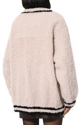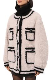 Для пошива свободного жакета со спущенной линией плеч и четырьмя накладными карманами использовали фактурную коротковорсовую овчину. Из такого же материала выполнили узкую контрастную отделку, подчеркивающую края деталей.