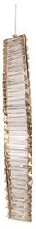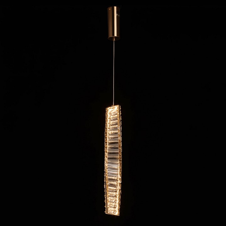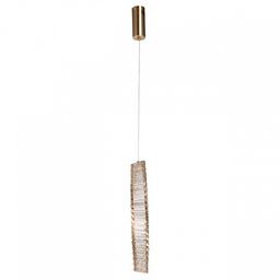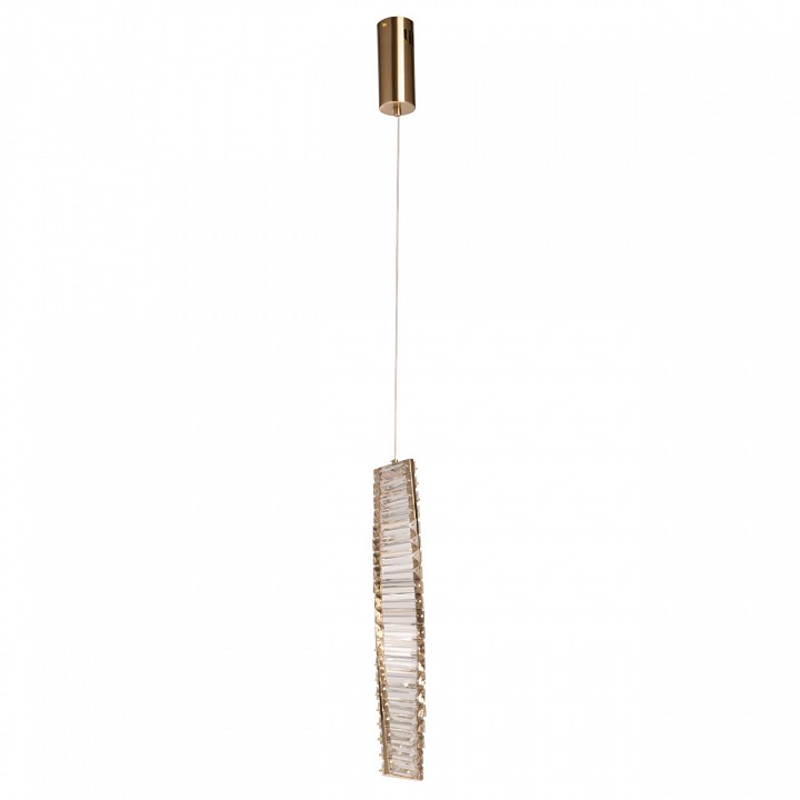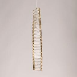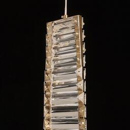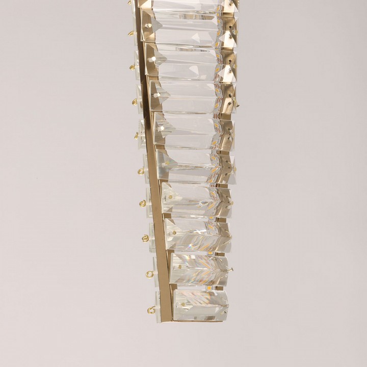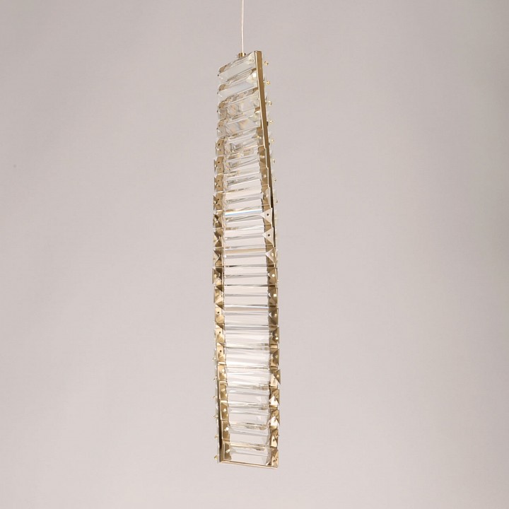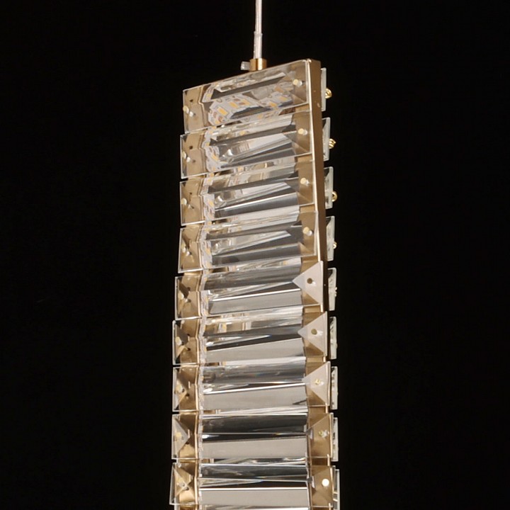 Металлическое основание подвесной люстры гальванизировано в цвет латуни. Люстра декорирована прозрачным хрусталем.