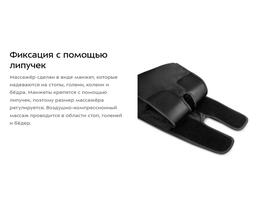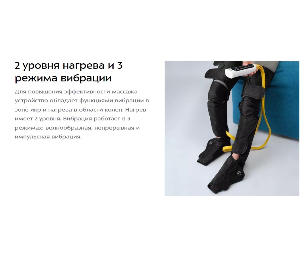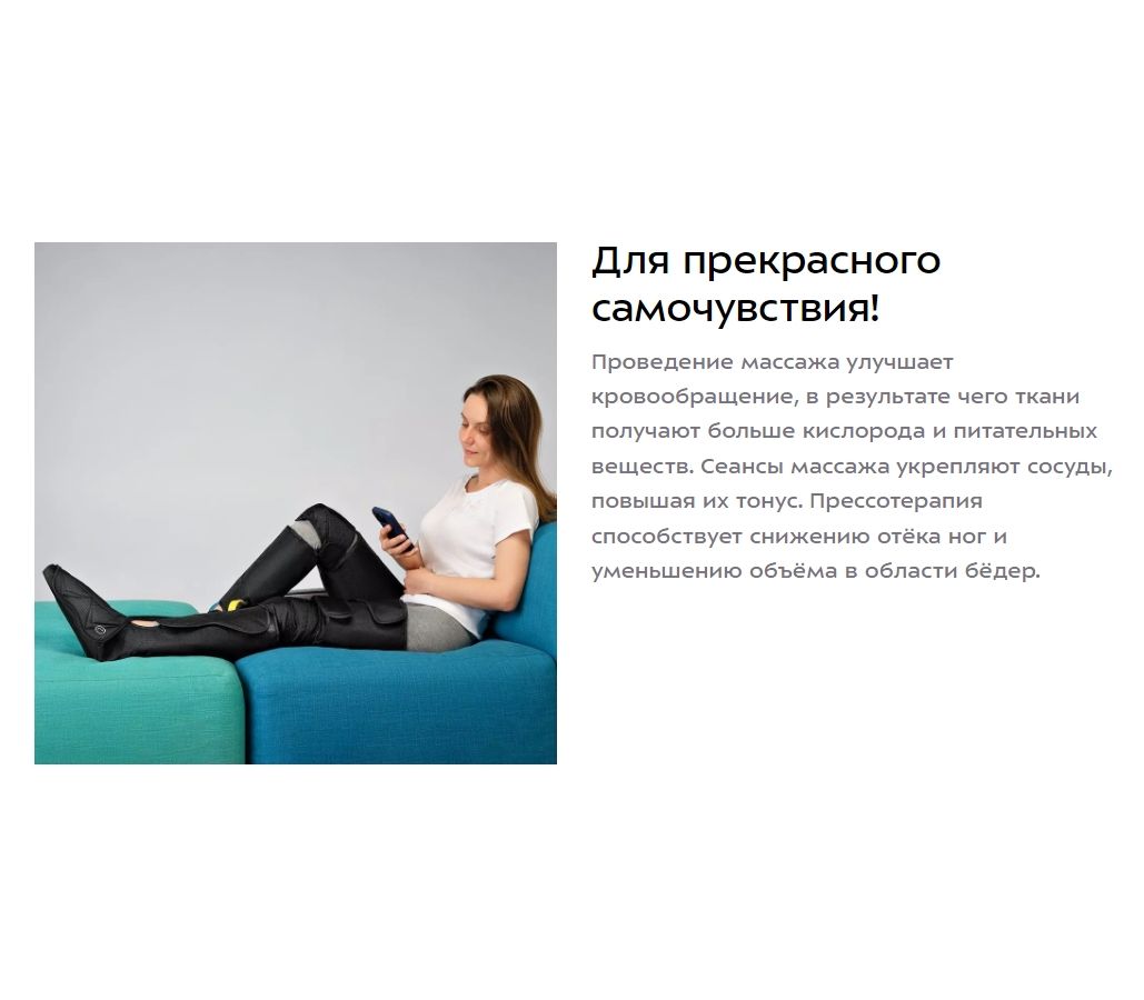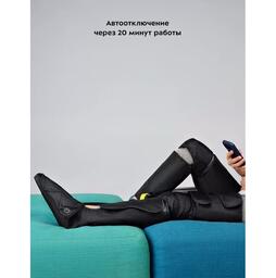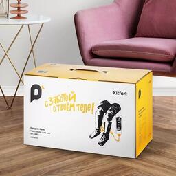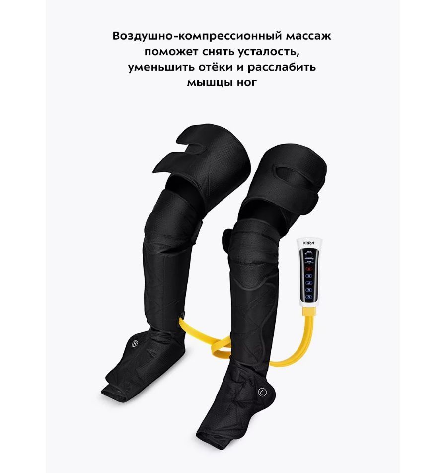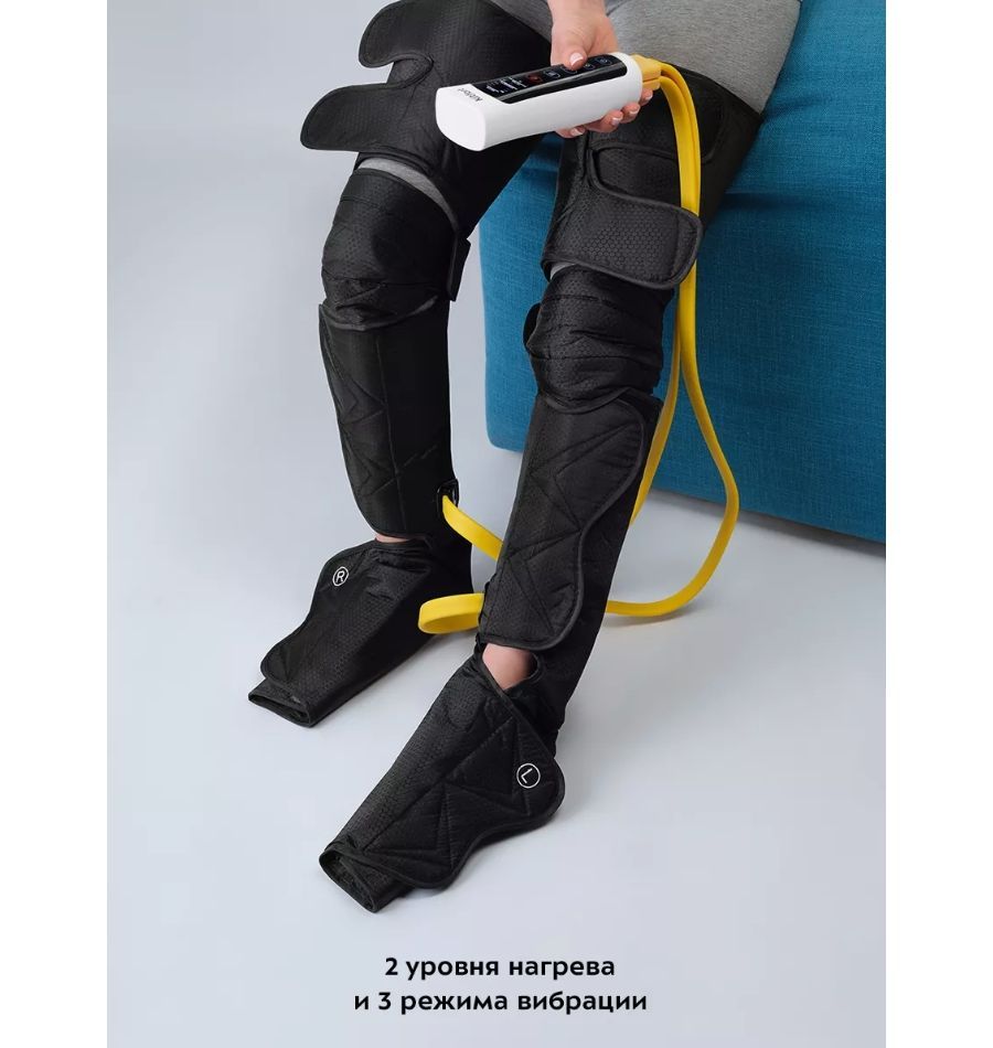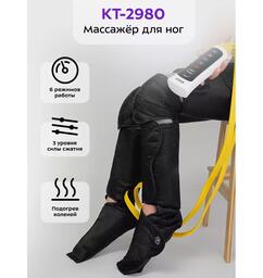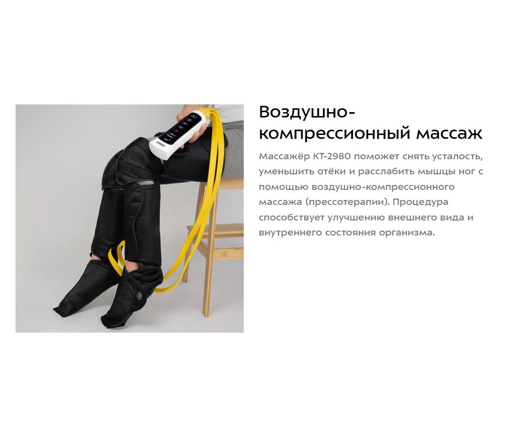 Массажёр КТ-2980 поможет снять усталость, уменьшить отёки и расслабить мышцы ног с помощью воздушно-компрессионного массажа (прессотерапии). Процедура способствует улучшению внешнего вида и внутреннего состояния организма. Массажёр сделан в виде манжет, которые надеваются на стопы, голени, колени и бёдра. Манжеты крепятся с помощью липучек, поэтому размер массажёра регулируется. Воздушно-компрессионный массаж проводится в области стоп, голеней и бёдер. КТ-2980 работает в 6 разных режимах. Интенсивность массажа настраивается: вы можете выбрать минимальную, среднюю или максимальную интенсивность. Управление массажёром осуществляется с помощью пульта. Через 20 мин работы массажёра сработает автоотключение. Для повышения эффективности массажа устройство обладает функциями вибрации в зоне икр и нагрева в области колен. Нагрев имеет 2 уровня. Вибрация работает в 3 режимах: волнообразная, непрерывная и импульсная вибрация. Проведение массажа улучшает кровообращение, в результате чего ткани получают больше кислорода и питательных веществ. Сеансы массажа укрепляют сосуды, повышая их тонус. Прессотерапия способствует снижению отёка ног и уменьшению объёма в области бёдер. Внимание! Имеются противопоказания. Перед применением рекомендуется проконсультироваться с врачом.