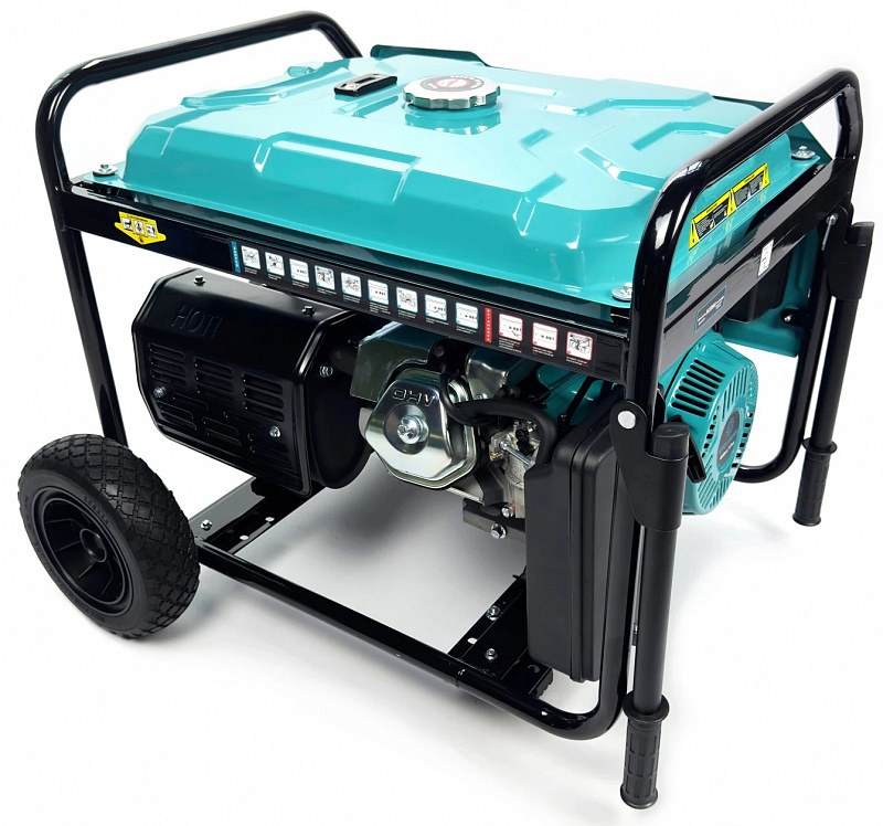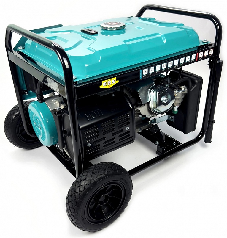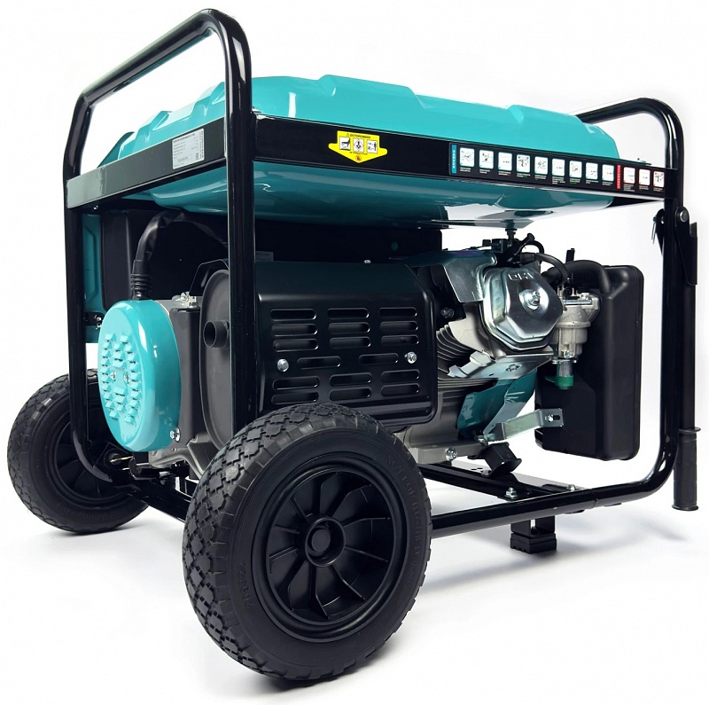 Синхронный однофазный генератор оснащен мощным бензиновым двигателем. Мощность мотора составляет 17 л.с., его объем 445 куб.см. Генератор запускается 2-мя способами: ручным стартером либо электростартером от аккумуляторной батареи.