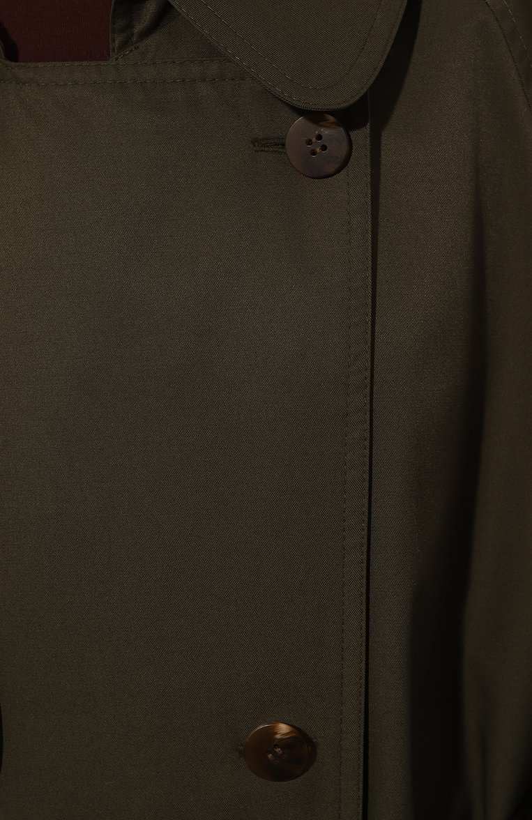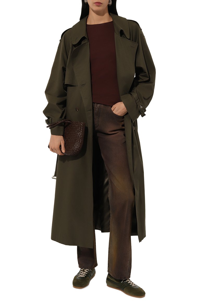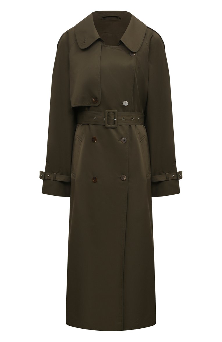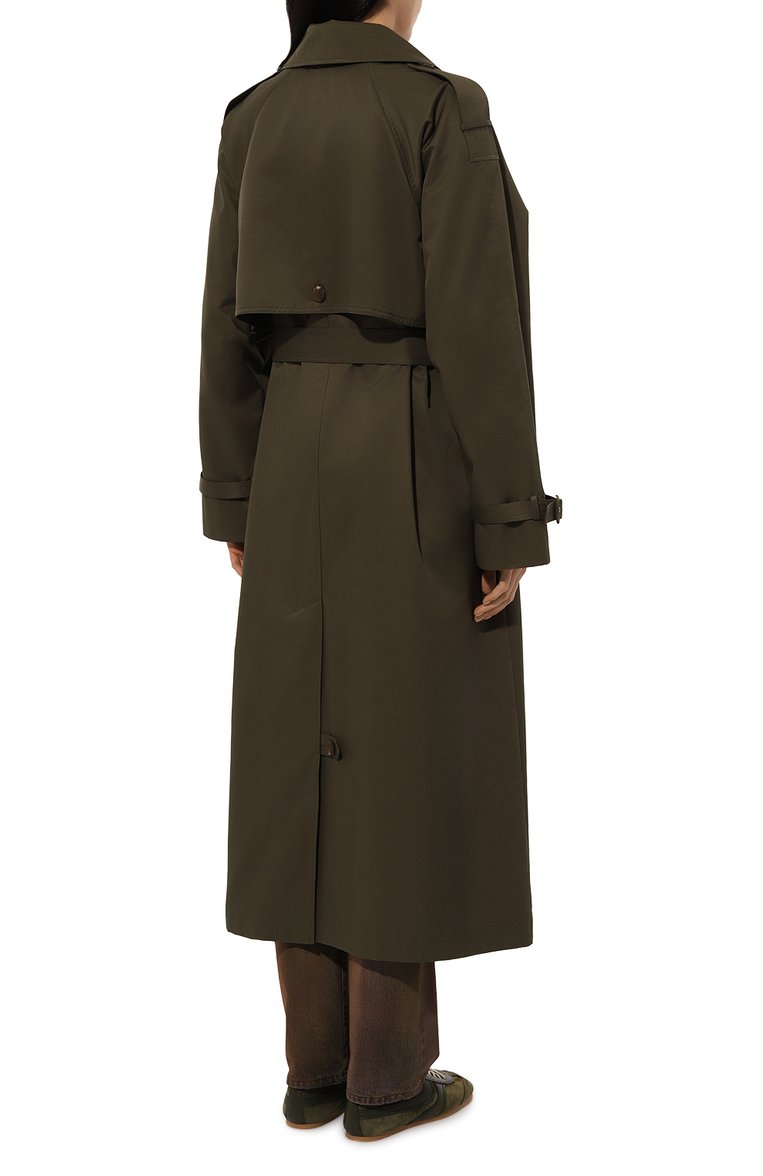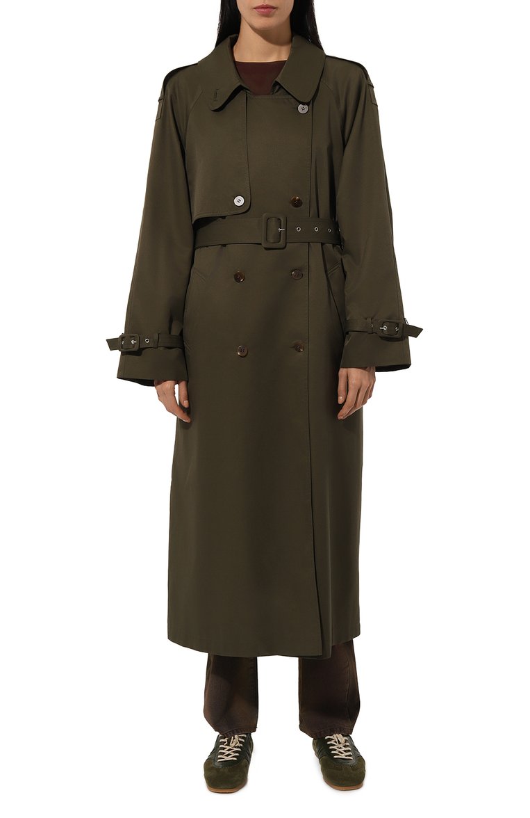 Двубортный тренч с отлетной кокеткой, погонами и патами сшили из прочного габардина на основе хлопка и полиэстера. Модель с рукавами реглан дополнили боковыми карманами и ремнем с прямоугольной пряжкой, обтянутой тканью в тон.