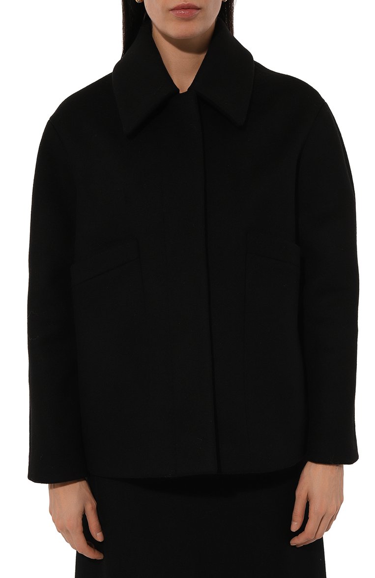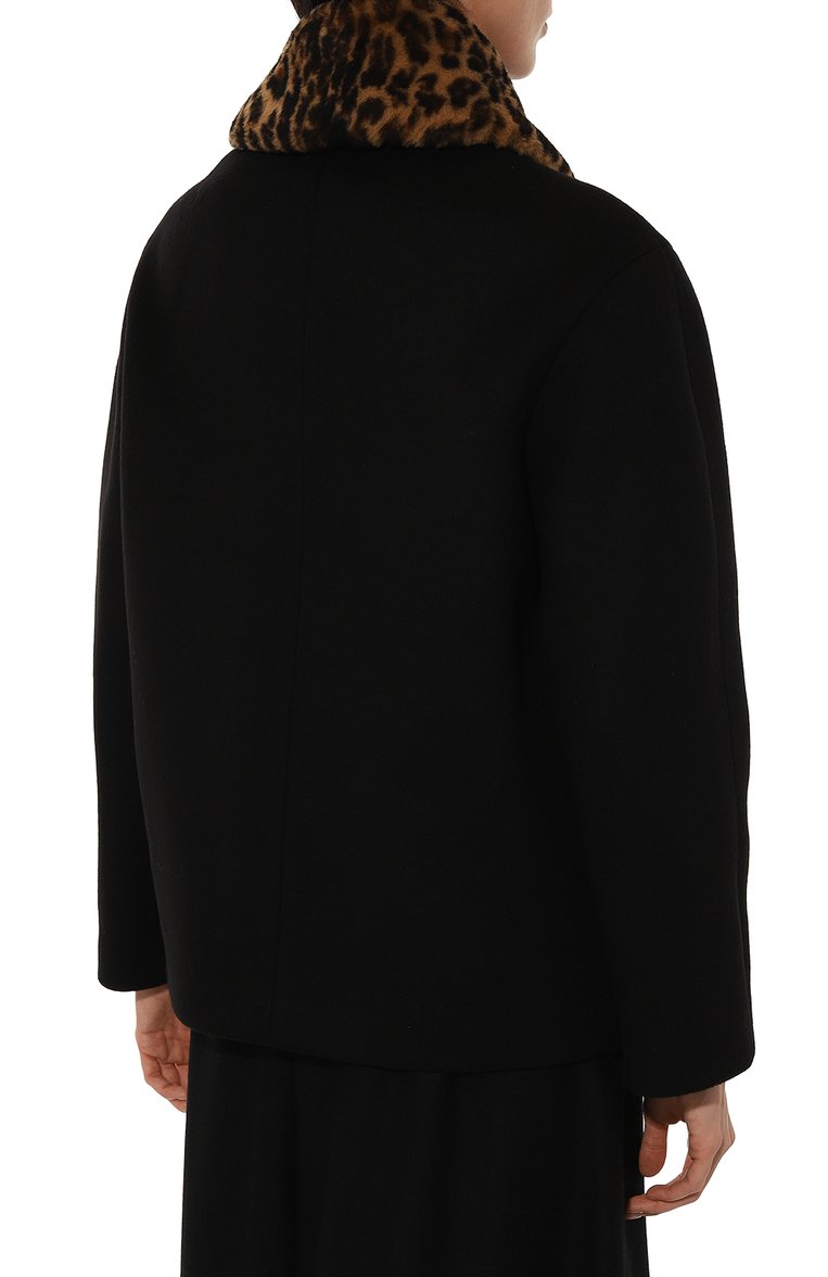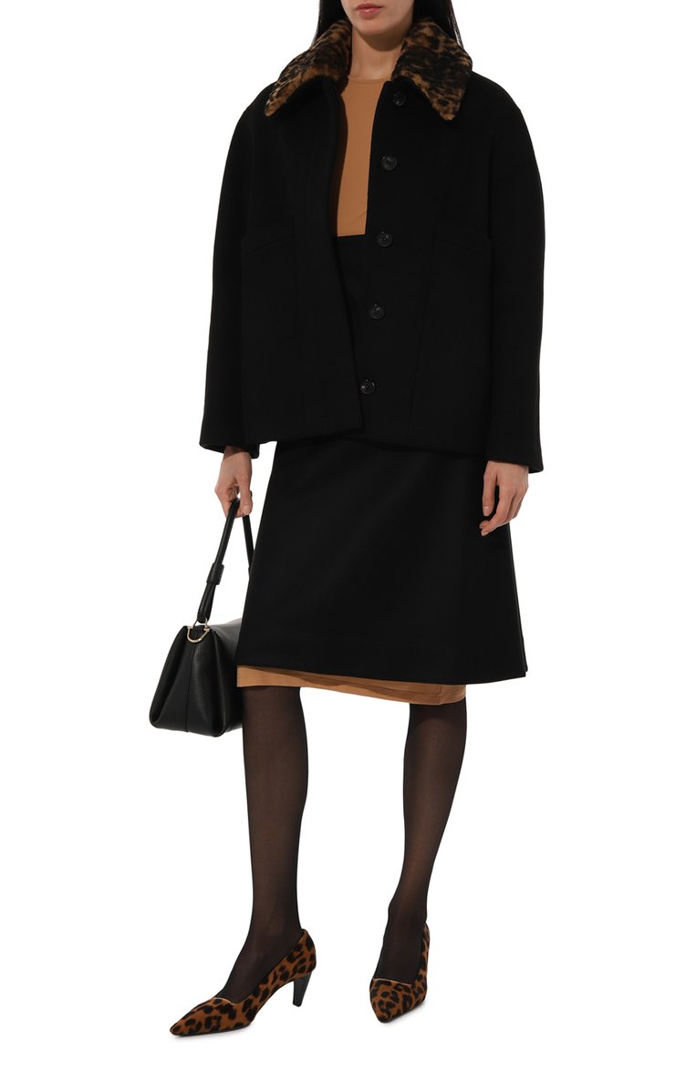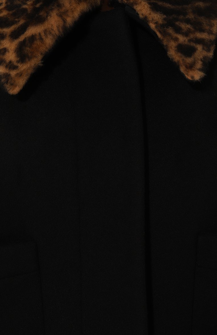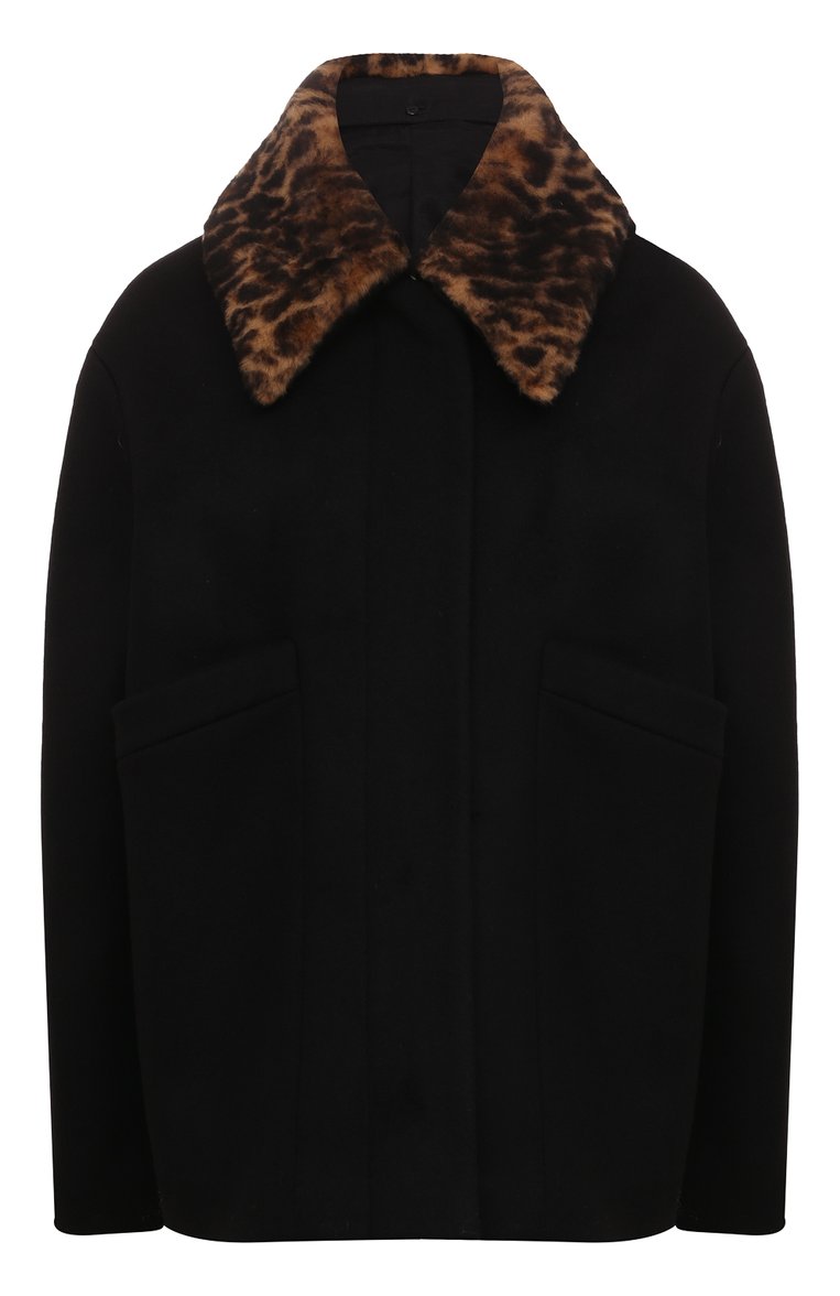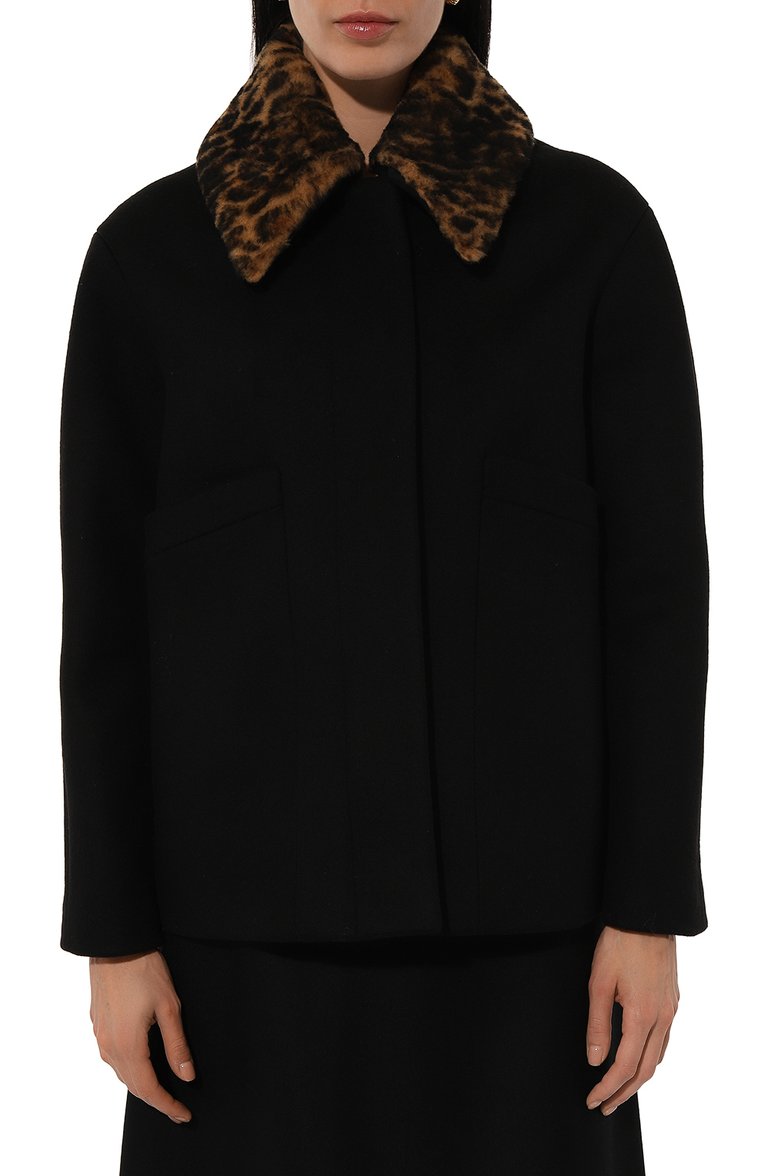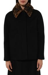 Леопардовый воротник полупальто из микса шерсти и полиамида сделали съемным. Модель с двумя боковыми карманами и вискозным подкладом застегивается потайными пуговицами.